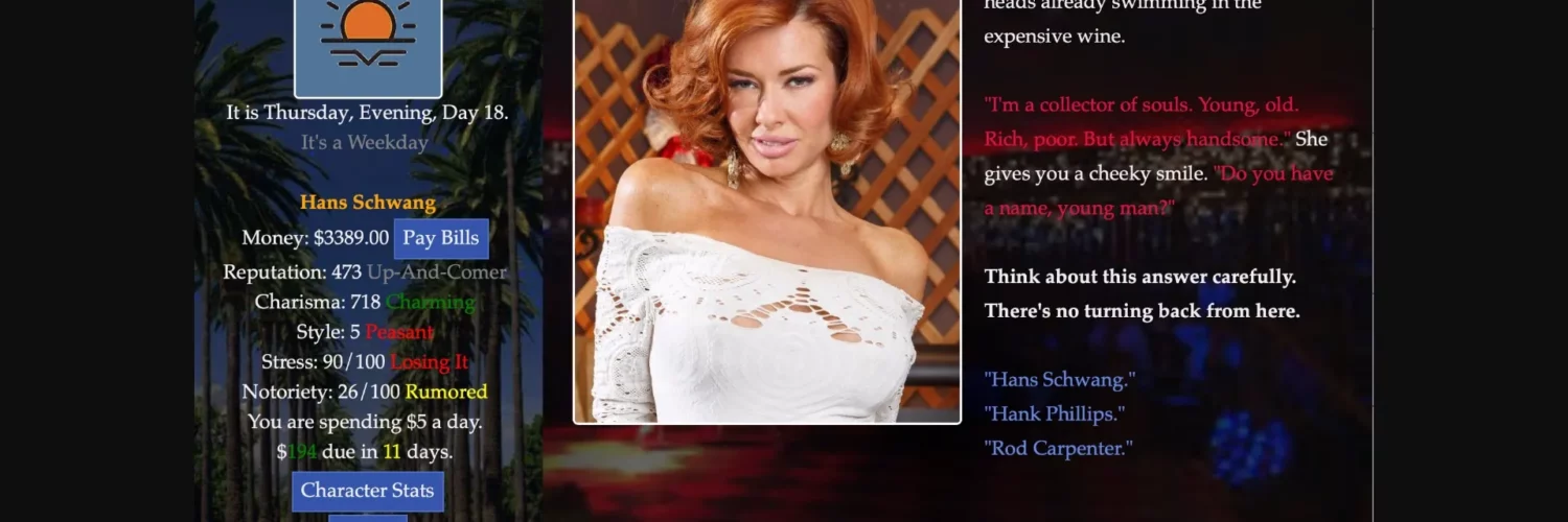 Although still in development, the game has hours of content, a list of stats and perks to progress in, and numerous women to seduce and sleep with. Come see what all the fuss is about.
