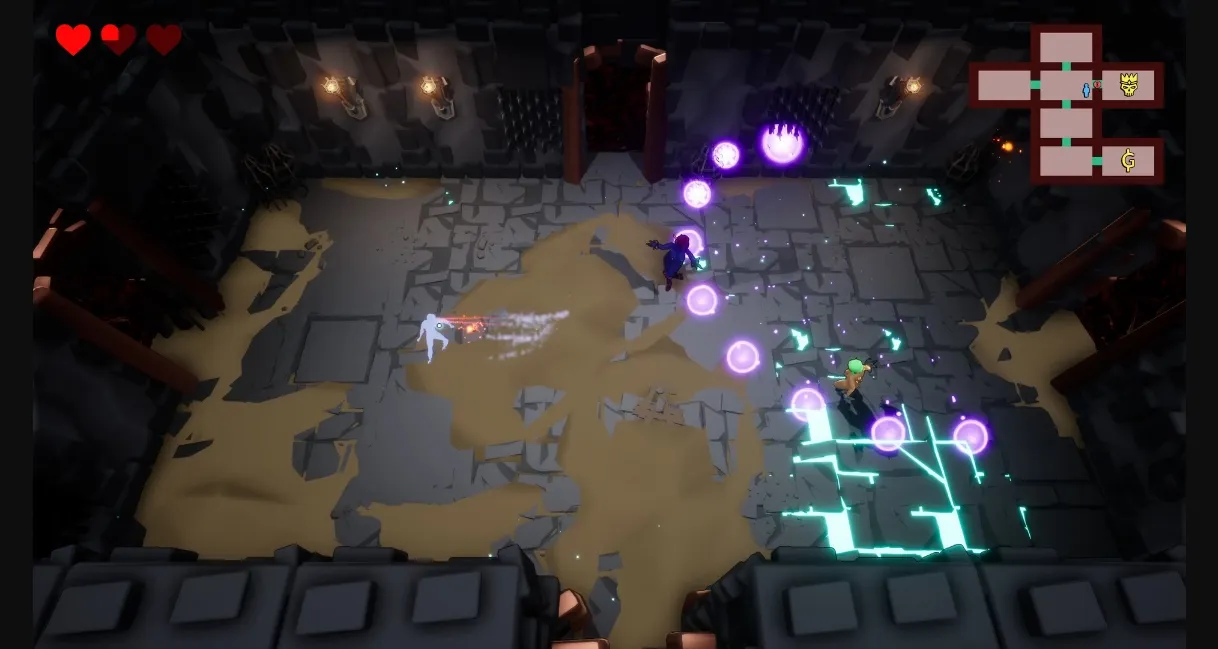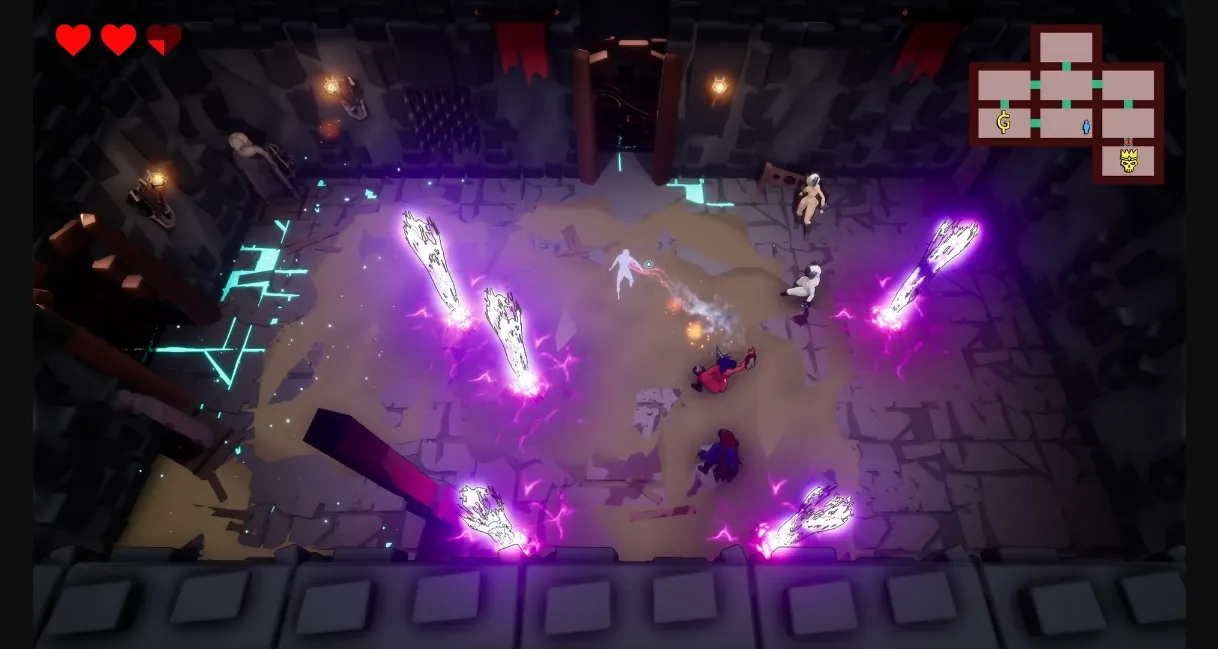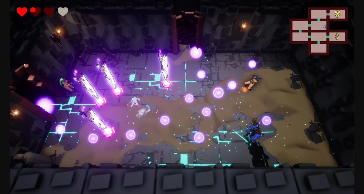 – New control scheme and aiming improvements: The previous build was using a camera system that followed the player, now we have a static camera instead, you will always be able to see the entire room at a glance! Along with this system, we have some locomotion changes to help control the game, hitting shift will teleport in the direction of movement rather than the direction of the mouse. More control!