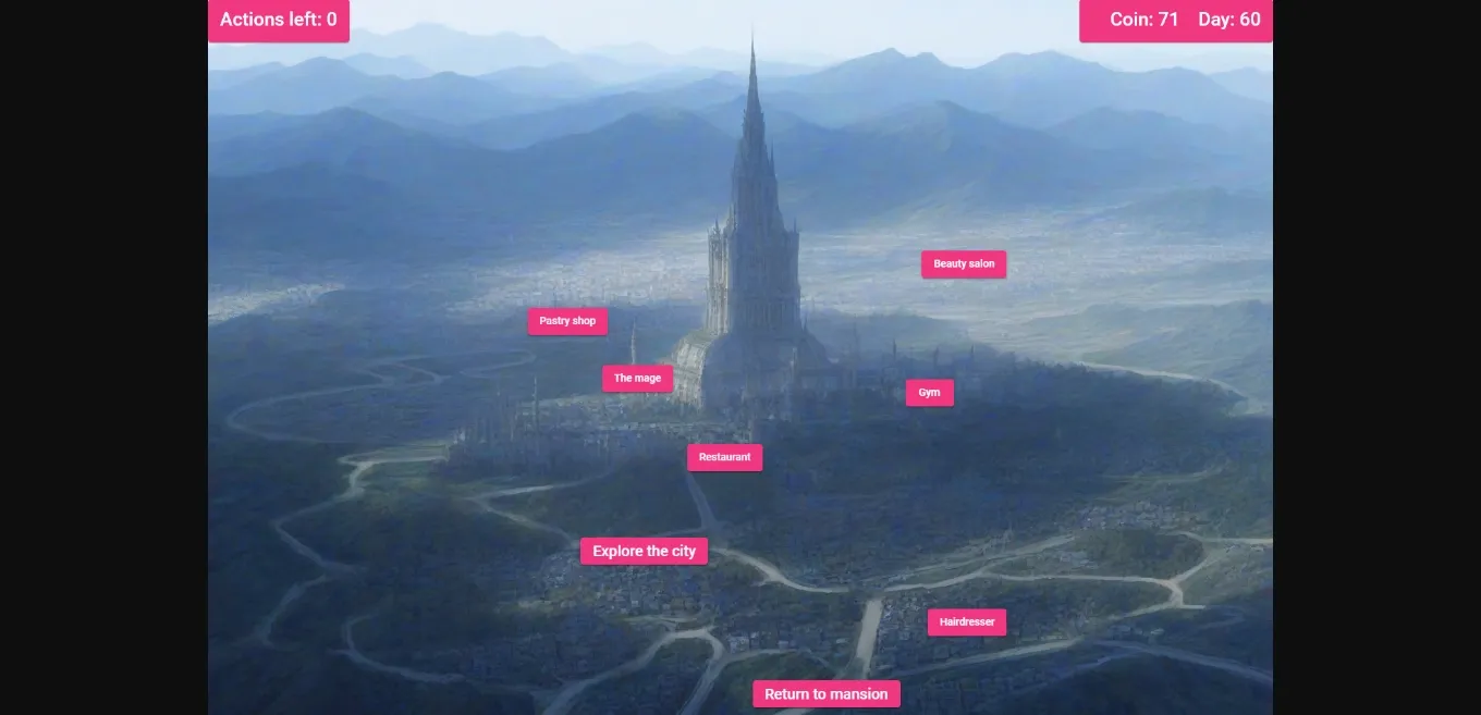 This update makes it possible to leave the mansion and visit a few places in the city. To leave the city, you need to meet one of two conditions: either learn the Elven language and convince the guard to let you out, or earn enough money and the mistress will let you out. The amount you need to earn depends on your looks and starts at 600 coin for the worst looks, going all the way to 6000 coin for the best ones.