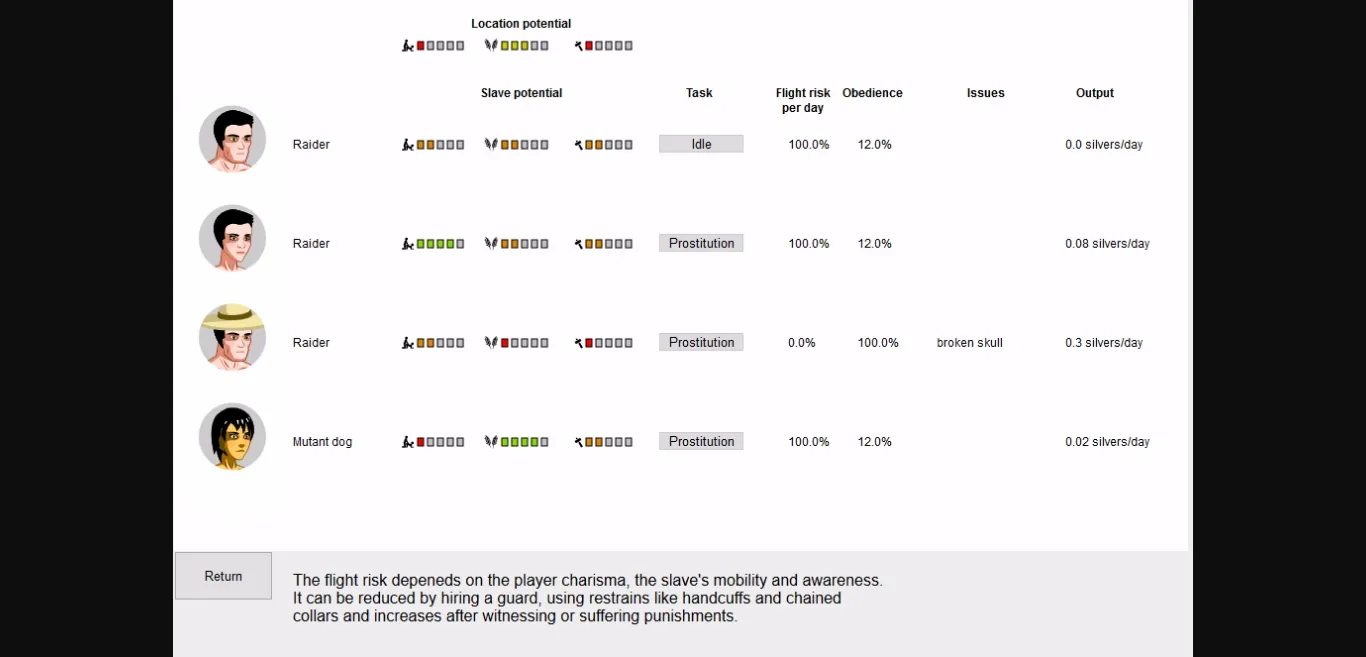 - Player has several choices to adjust slave productivity, obedience and risk of flight, such as giving corporal punishments, equipping with tools, forcing restrains in them or injuring them.