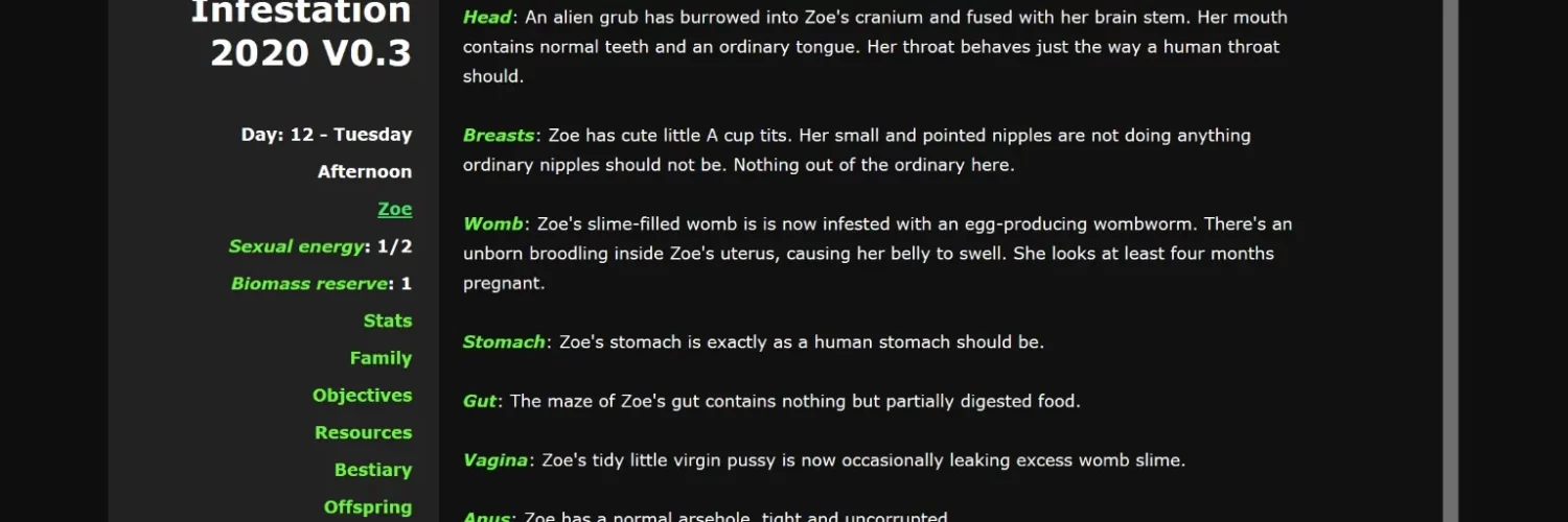 You play from the perspective of Zoe, an 18 year old university student at home for the summer. Under the influence of a friendly if not rather pushy alien parasite, she embarks on a lust-filled quest to corrupt and infest the members of her immediate family. As the player, you will get to steer Zoe through her quest, helping her find ways to seduce those close to her, set up a harmonious and efficient breeding machine, and dominate the home, the street, the city and then, who knows … maybe the world?
