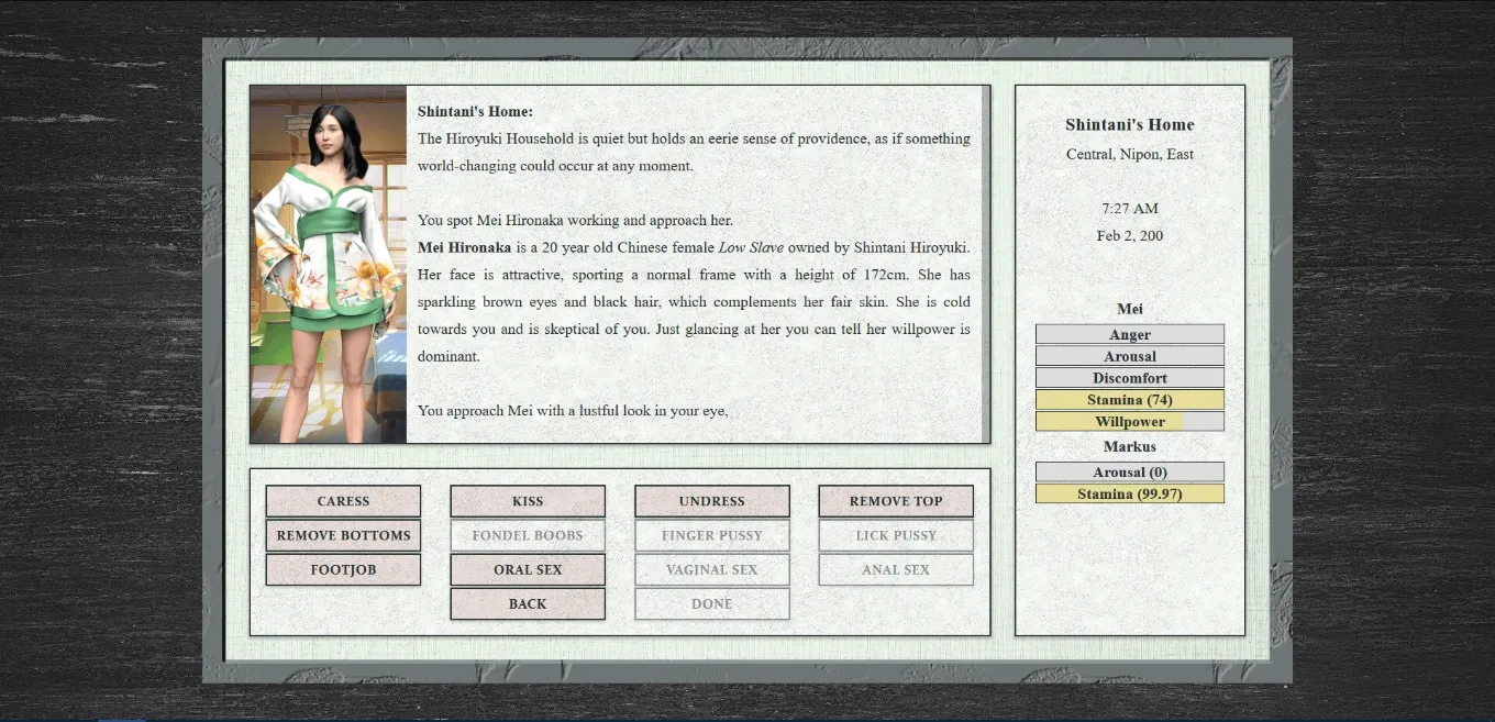 Subphase 2: Once you raise your status you will be able to leave Shintani’s home and explore Nipon. Here you can interact with the economy and make money by working at the Mines. You can train at the barracks as well. You will be able to start molesting Shintani’s slaves by increasing your willpower (from being outside) and interacting with them past 12AM. While you could do this earlier, it’s only feasible now since you can raise your willpower. Finally you’ll also be able to purchase your own slaves and manage them.