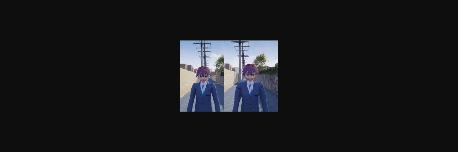 -finished editor basics; both male and female characters can now be modified. New gakuran outfit for male characters. Hair style choices are spiky and pompadour. Hair color choices are brown and black. Eye color choices are blue and black. Initial release’s placeholder is still present for the blazer outfit.