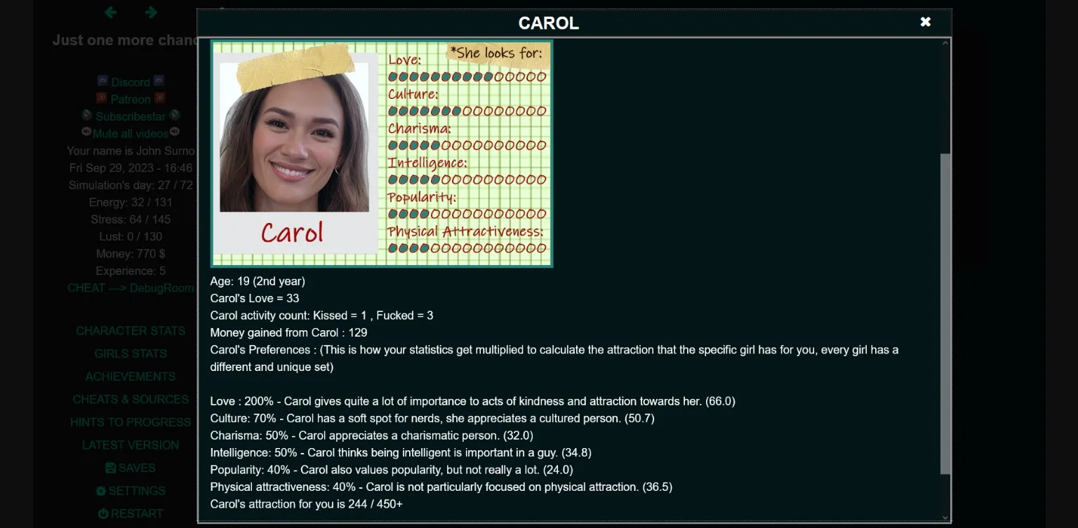 – Fixed a couple of issues with Melanie and Carol showing the wrong value(but calculating the right one) in the Girls Stats screen