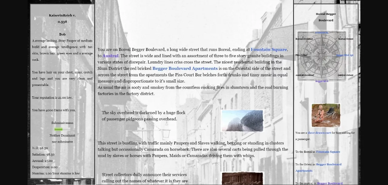 KaiserinReich is a femdom themed, open world AIF game based in the world of KaiserinReich at the dawn of the 20th century. KaiserinReich is a strictly hierarchical, deeply misandrous society. Women rule, men are inferior and you have the misfortune of having been born a male in this world. KaiserinReich’s open world design is intended to allow you to explore the areas and story lines that interest you and develop your character however you desire.
