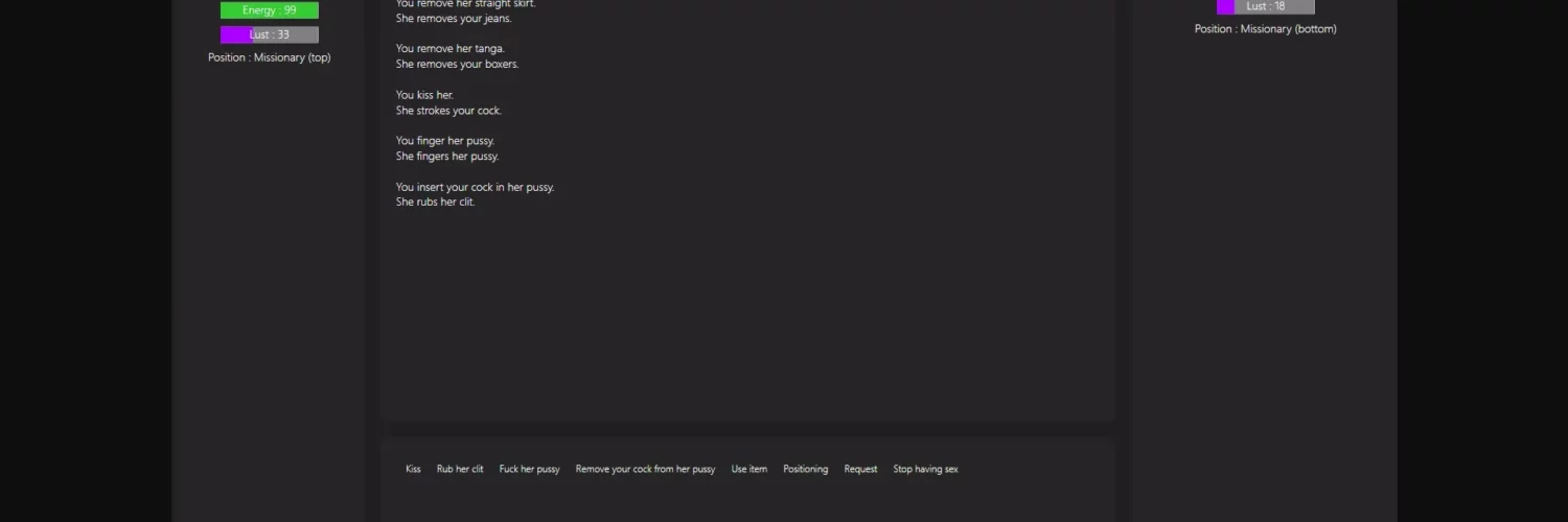 This is a life simulation adult game. It is mostly text-based, the player interracts with the buttons available on the screeen. This game generates random NPCs the player can talk with, hang out with or even have sex with. The player can find a job to make money, entertain themselves going to the cinema, or getting a better physique when going to the gym. The game is in an early stage of development.