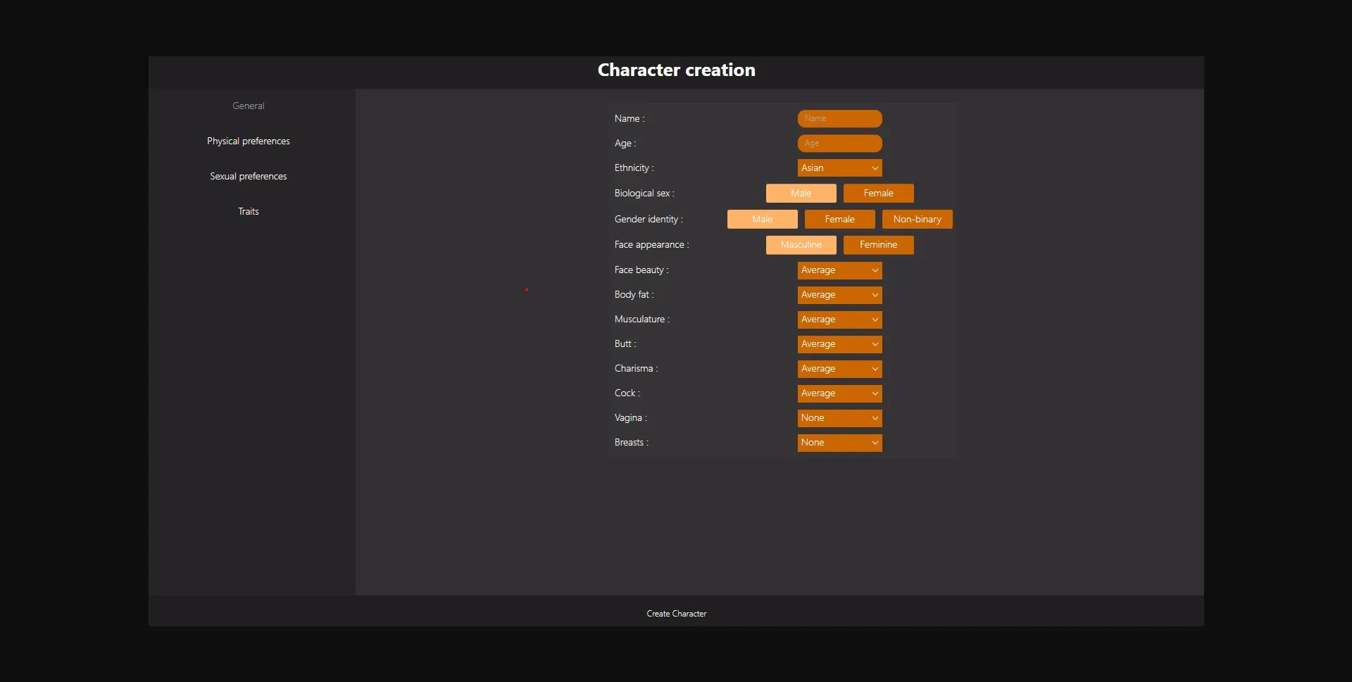 -When creating a new game you will now be able to setup your game as you prefer. Ajustable variables are number of random Npcs, biological repartition, gender identity repartition, sexuality repartition and ethnicity repartition.