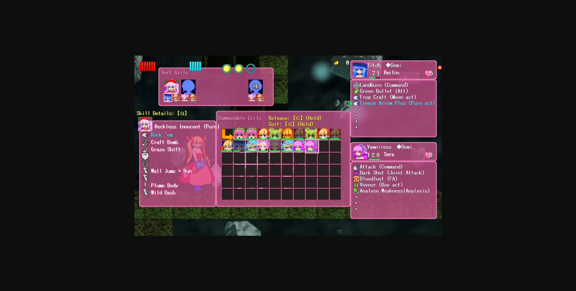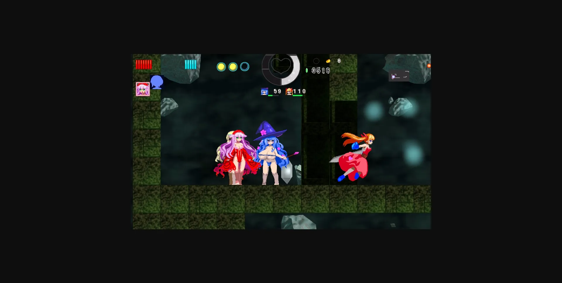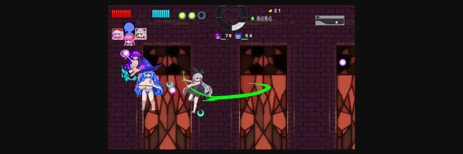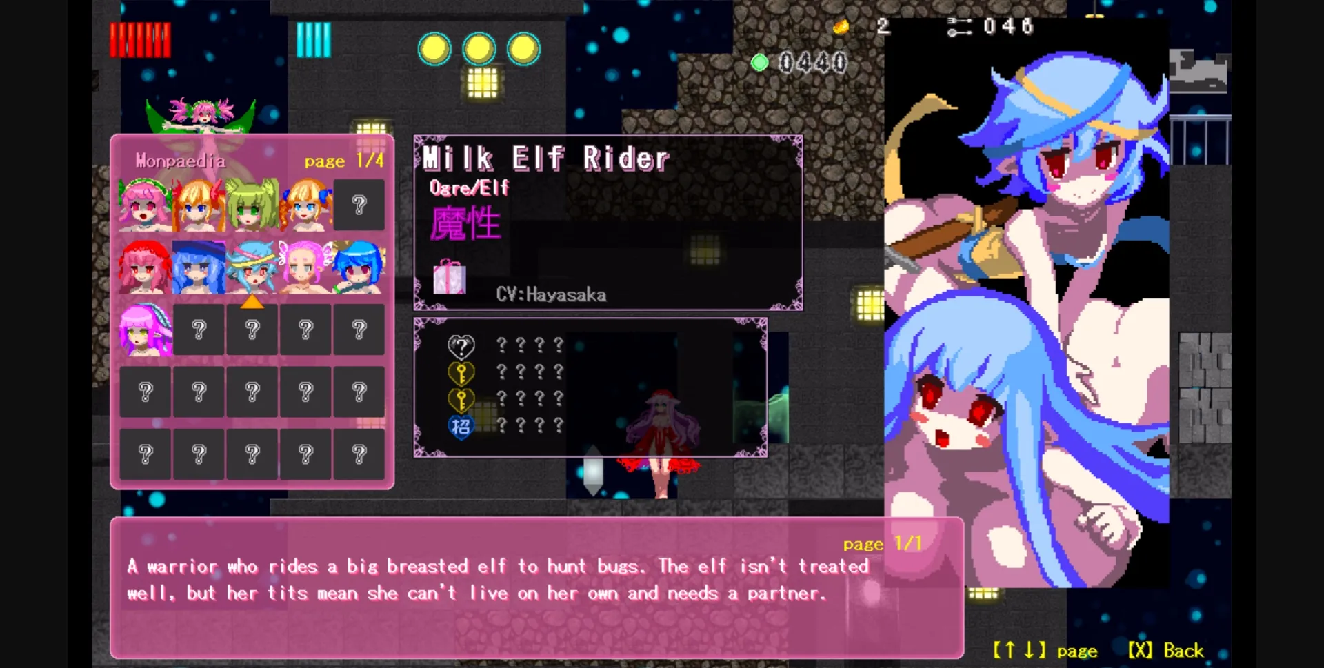 Magic Castle RePureAria 2 is the sequel to Magic Castle RePureAria. Like the first game it’s a 2D Metroidvania style game, where you navigate a maze-like castle to collect new items, skills and forms to transform into. By having sex with monster girls they might even form a contract with you, allowing you to call upon their skills to further power up. The game is longer and more in depth than the first; now, each familiar is a unique ally with her own set of skills that can be changed and improved.