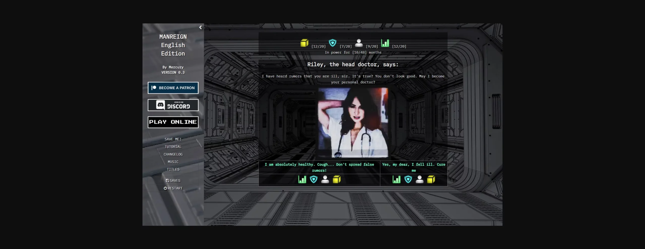 [ Riley’s quest and her help menu (selected by patrons!) ] [ Krystal’s quest and her help menu ] [ Dakota’s quest and her help menu ] [ 12 new event cards ] [ New improvement option: "Consequence forecasting" (learn the consequences of your decisions before you make them!) ] [ New improvement option: "New production technologies" (get a passive gain of the Resource element until the end of the reign!) ] [ Some thousands of code and text characters, can’t count now xd ]