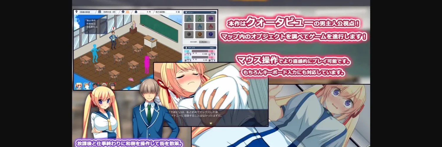 2D Game, 2DCG, Animated, Censored, Japanese Game, Male Protagonist, Multiple Endings, Voiced, Anal Sex, Ahegao, Big Ass, Big Tits, Corruption, Creampie, Dilf, Exhibitionism, Groping, Handjob, Humiliation, Incest, Male Domination, Masturbation, Netorare, Oral Sex, Sex Toys, Sexual Harassment, Shota, Teasing, Titfuck, Vaginal sex, Voyeurism, PoV, Romance, Sandbox, School setting,