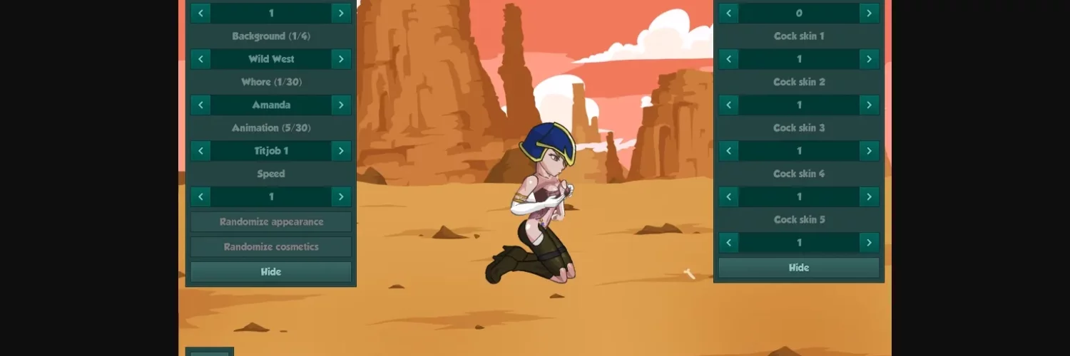 "86jfz" = Enable cheat mode "butnowicansee" = Unlock all "pimpthemall" = Hire all characters "truepowder" = Customization Mode "thecockrush" = Transforms female to futa, and vice-versa "thedudeabides" = Remove Cooldown "finefeathersmakefinebirds" = All cosmetic items "greedisgood" = Money Cheat "goldmagnet" = Magnet Mode "showstats" = Self Explanatory