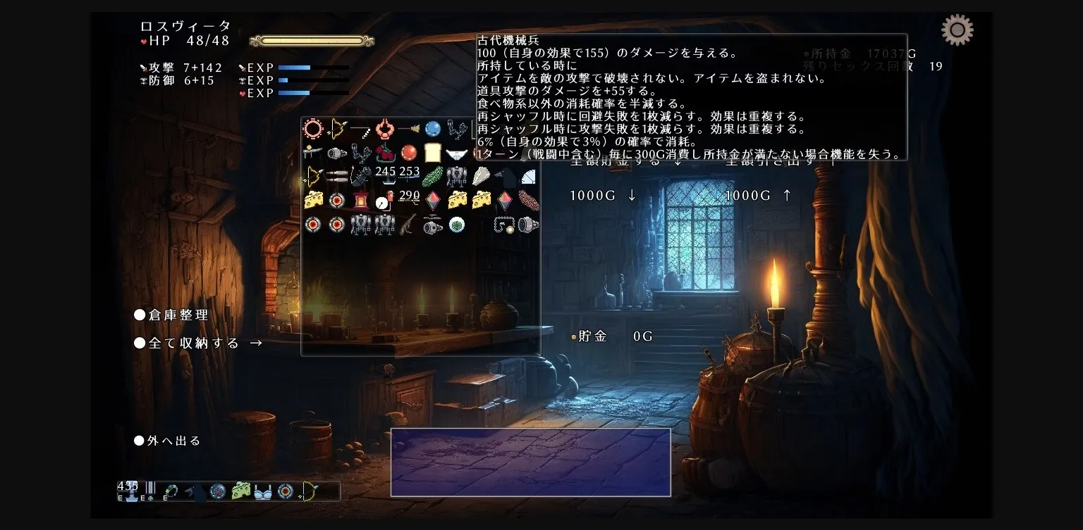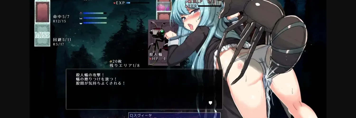 Roswitha is a saint who acts as your shield against monsters in this dungeon-crawler game that uses randomly generated cards and items to make progress. Your odds of hitting, orgasm, and dodging are displayed on screen – can you make it through without her succumbing to pleasure?