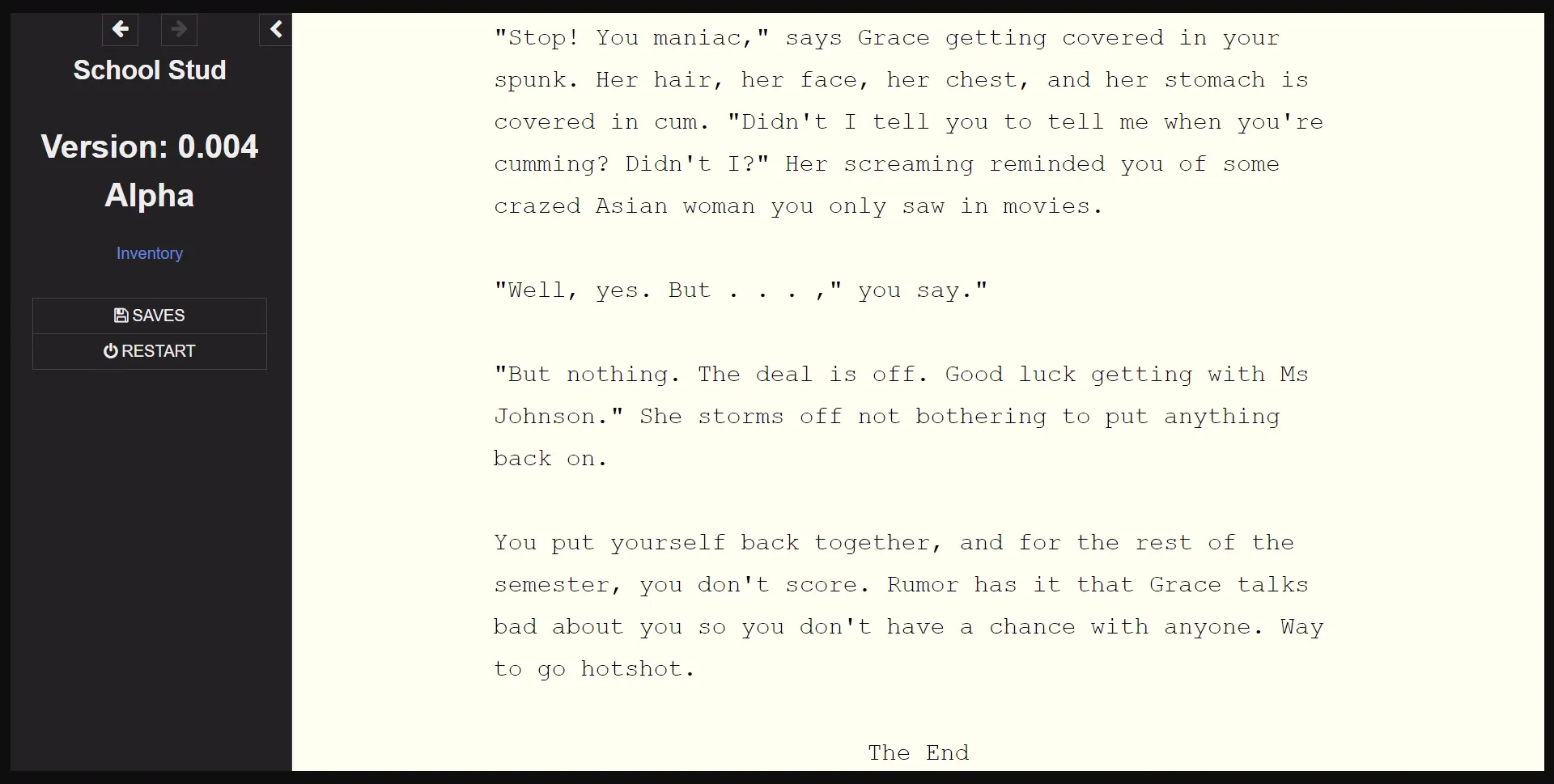 School Stud was made in Twine (HTML). It’s played on a browser. You can play this on a smartphone or a desktop or any device in between.