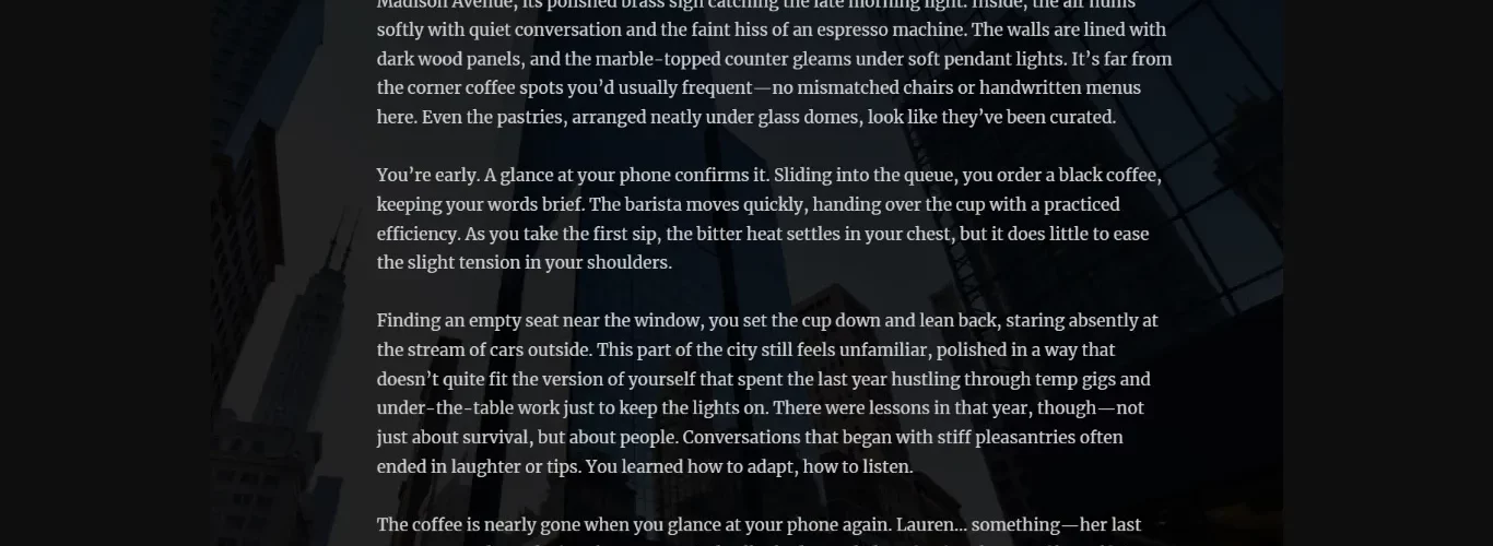 You’re a college dropout starting fresh at Eclipse, a high-end luxury goods company where ambition drives everything. As you climb the ranks, you’ll navigate demanding clients, competitive colleagues, and powerful women who challenge and shape your rise. In a world built on control and strategy, every step forward is a chance to prove yourself and secure your place at the top.