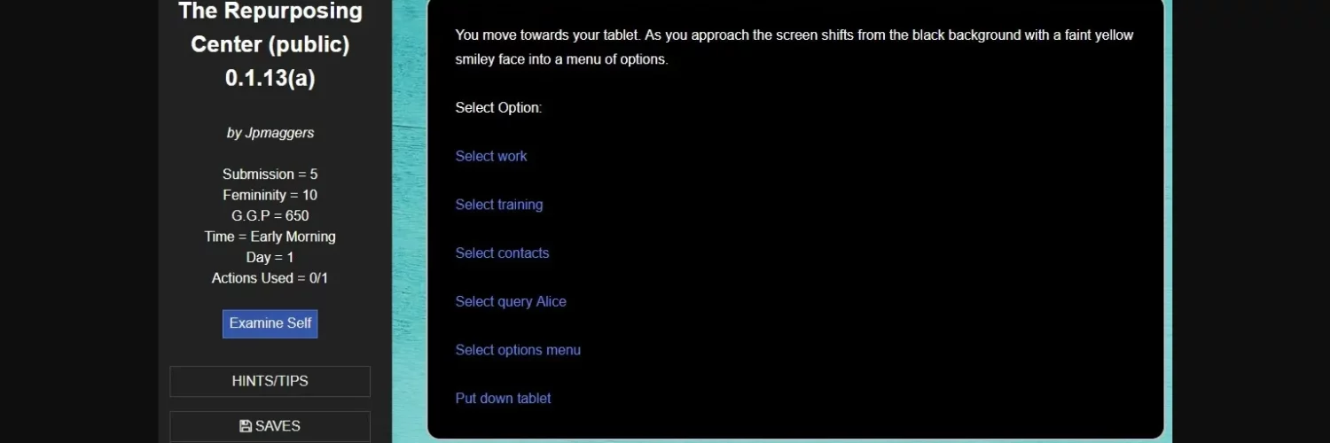 "The Repurposing Center" is an interactive erotic fiction about a dystopian not too distant future in which undesirables are carted off the streets by government capture vans so they can be repurposed into something more valuable to society. You find yourself in this very situation, trapped within the facility, being changed both physically and mentally to suit the whims of potential buyers who are your only way out. The game is a sandbox life simulator within "The Repurposing Center" where players will need to partake in work, training and socialization in order to secure themselves a happy ending when they finally place themselves up for auction.