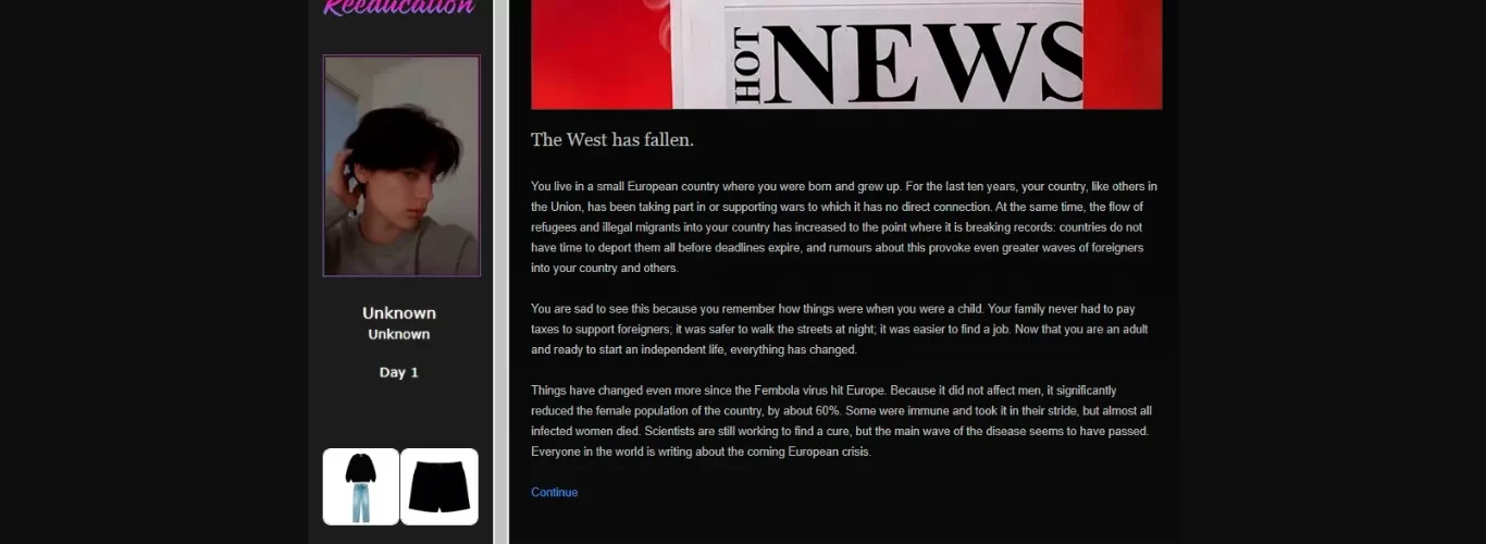 West Has Fallen: Reeducation is an 18+ text-based game that combines a near-linear narrative with open-world mechanics, offering the player a look at the new realities through the eyes of a young boy who has fallen into a group of beta boys. You’ll have to undergo retraining to adapt within the new world orders.