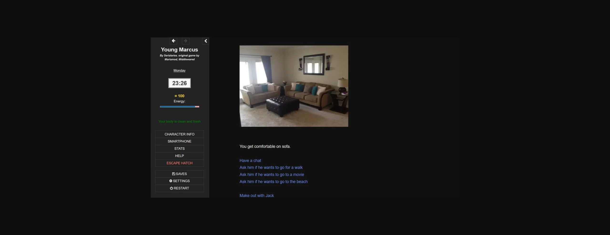 – Total redo of Marcus bedroom: additional activities plus lots and lots of sex scenes (some may lead to someone catching you ). Repeat few times for different outcome, also different outcomes depending on relations with the others.