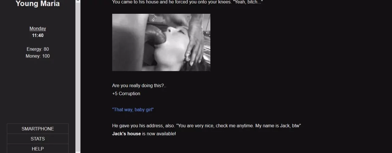 – Added a scene (by me & Plaze). From 22:00 to 23:59, you can walk up to your Parents’ bedroom door and hear them having sex (30% chance every day). You can peep and see a small scene with 3 new GIFs by getting 1 Corruption point. You can only watch once a day.