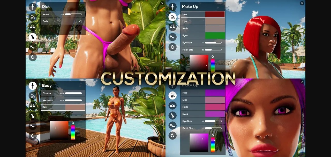 • Character customization to change hair, skin, wetness, and other features.