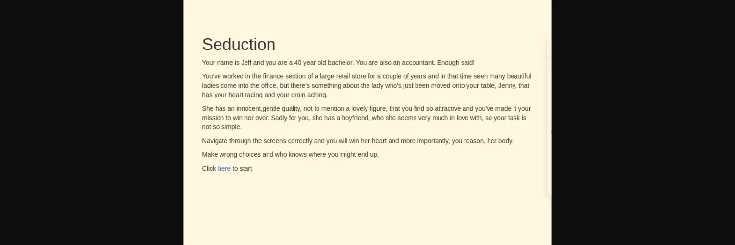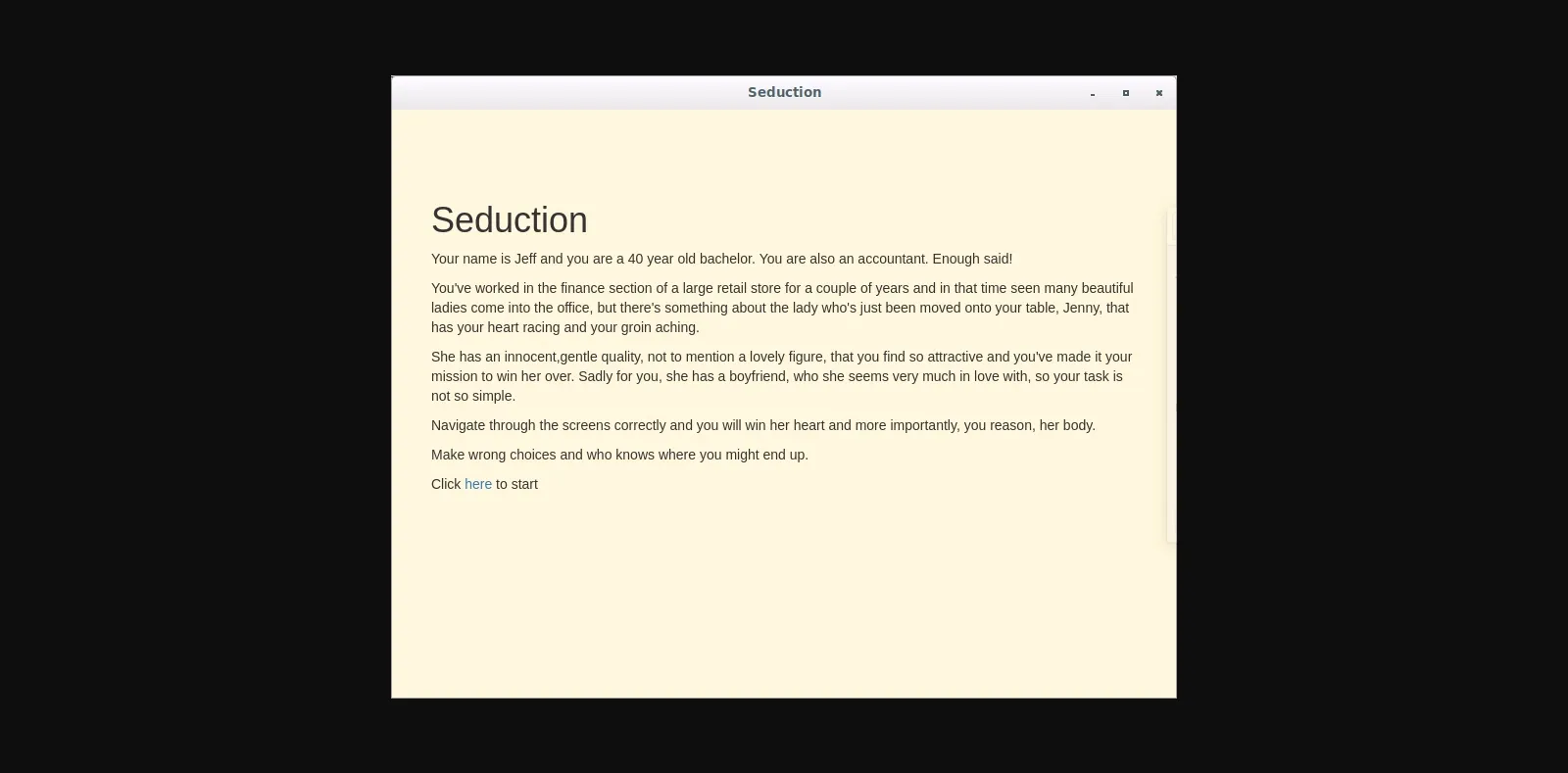 This is a short text based comedy(?) , running in Electron, I’ve written about a hapless accountants attempts to seduce a colleague.