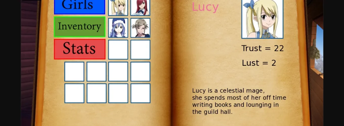 0.2: Added book menu, two lust scenes for Lucy, cg for Lucy’s lust scene. added more quests for different ranks. background for player room.