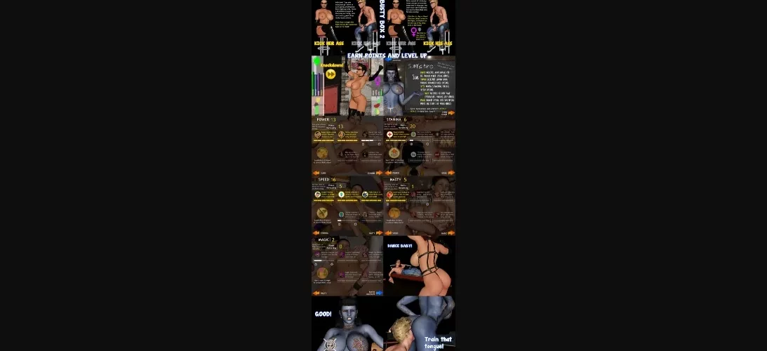 The ultimate sequel to Busty Box is here! Help Sam’s brother rescue his sister. Sam’s bro starts in the apartment HQ, where you can level up his boxing power by unlocking all sorts of new moves and stats, choose fights, view his harem of defeated girls, and have hun with a very sexy blue-skinned genie boxing coach… because why not?