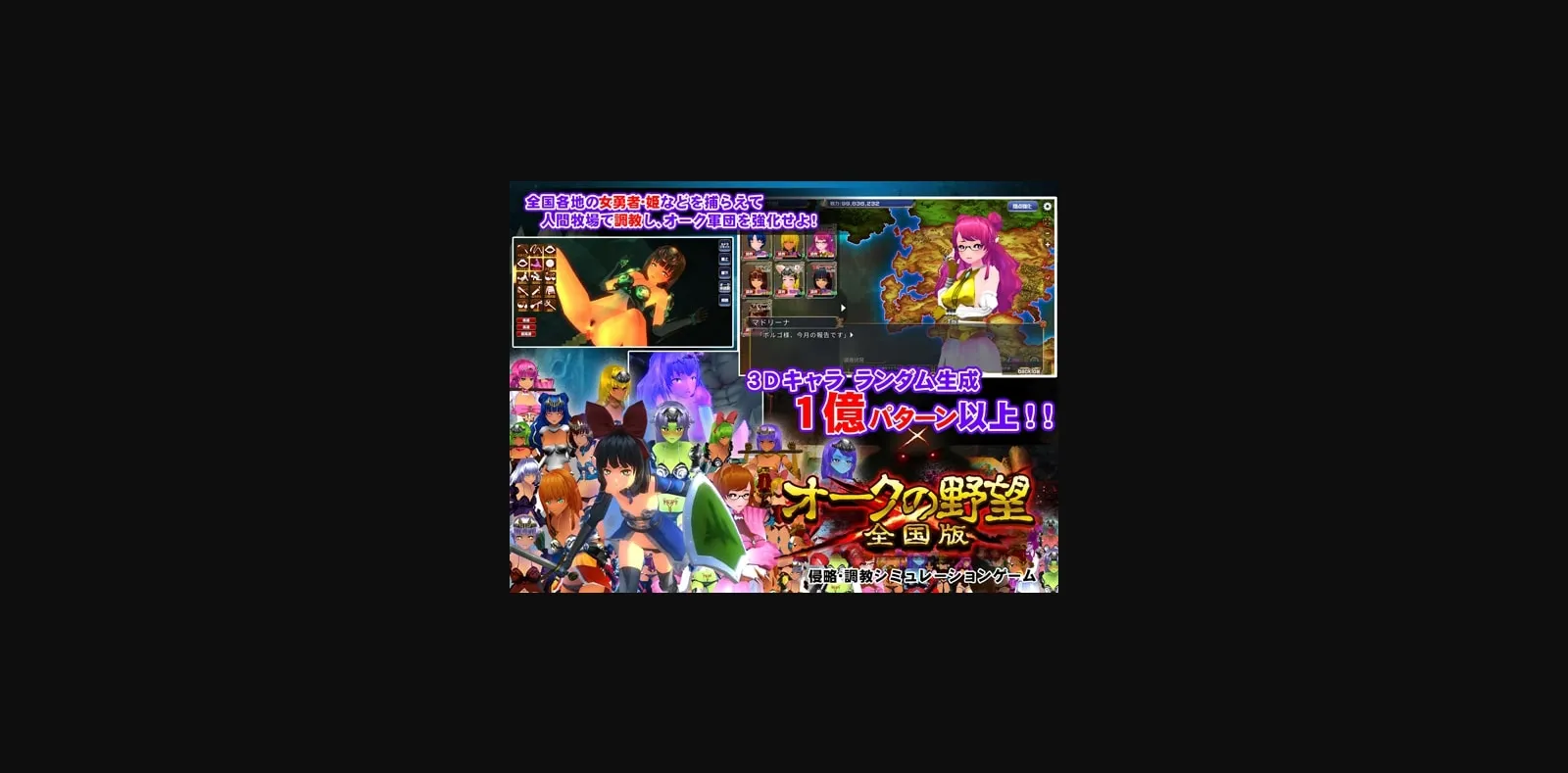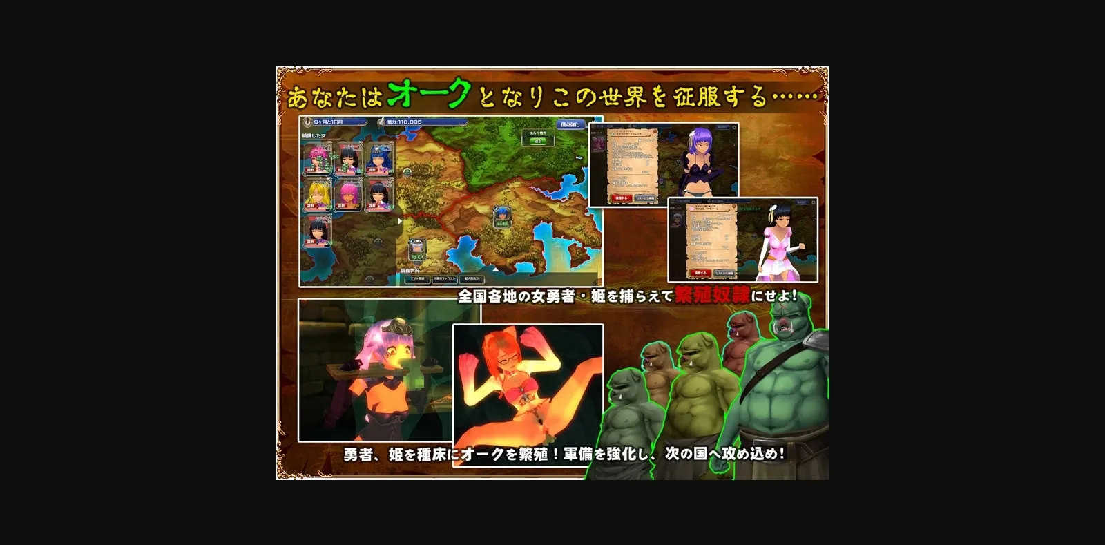 Capture the female heroes and princesses from all over the nation and ‘discipline’ them at your human farm to strengthen the Orc regimes!