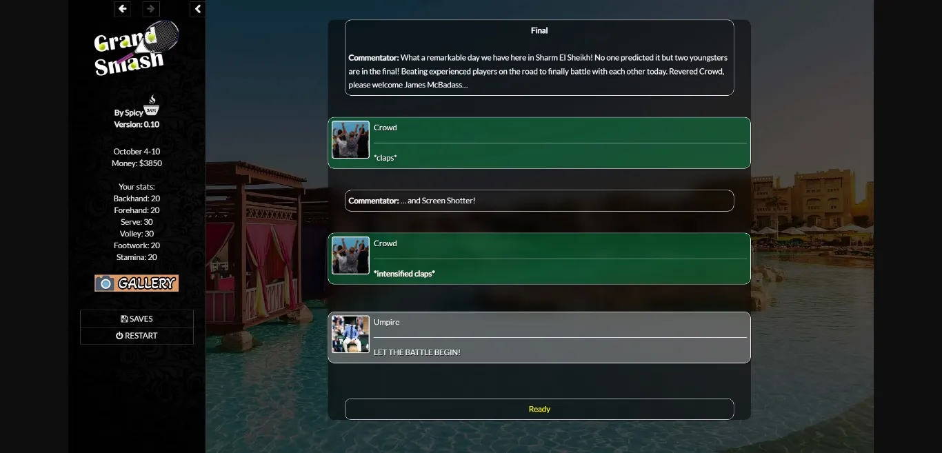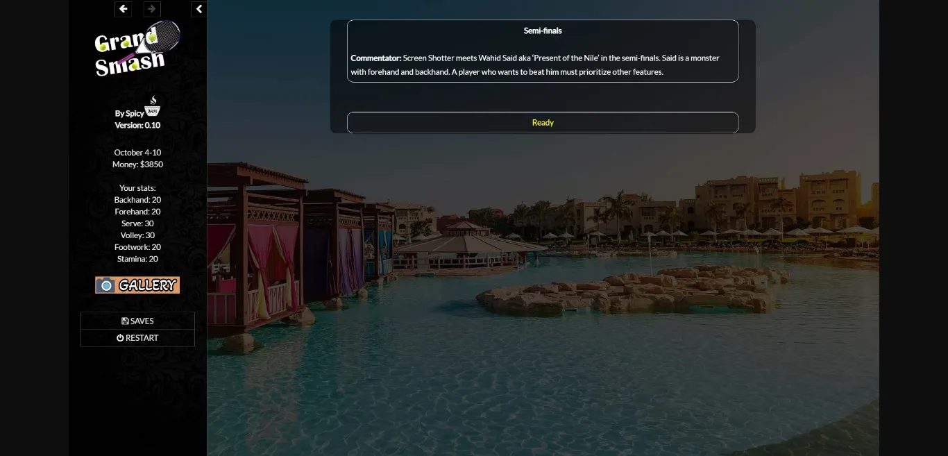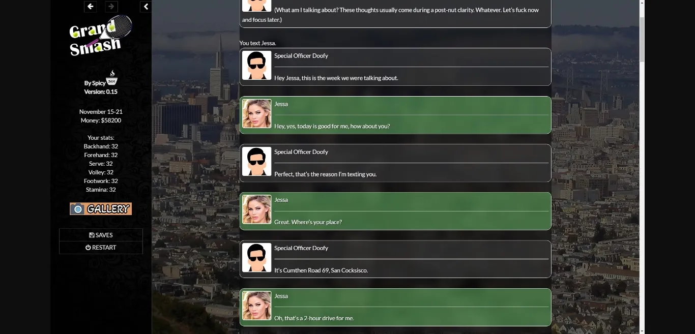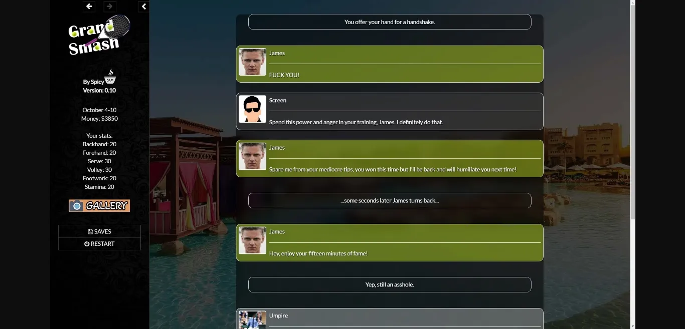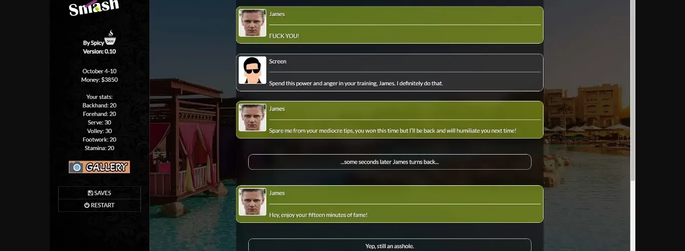 You play as an aspiring, young male tennis player who just left a mentally abusive relationship. After attending your last course in a tennis club, you are ready to unleash your power and your hairy yellow balls.