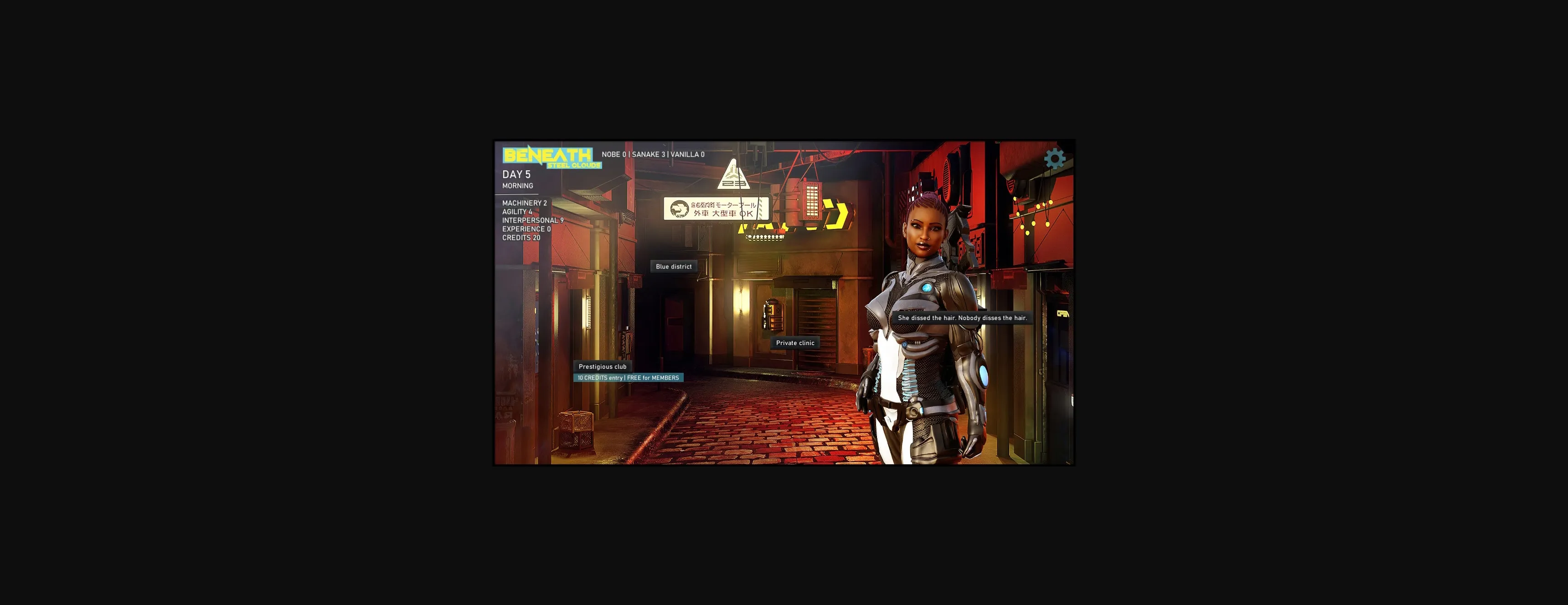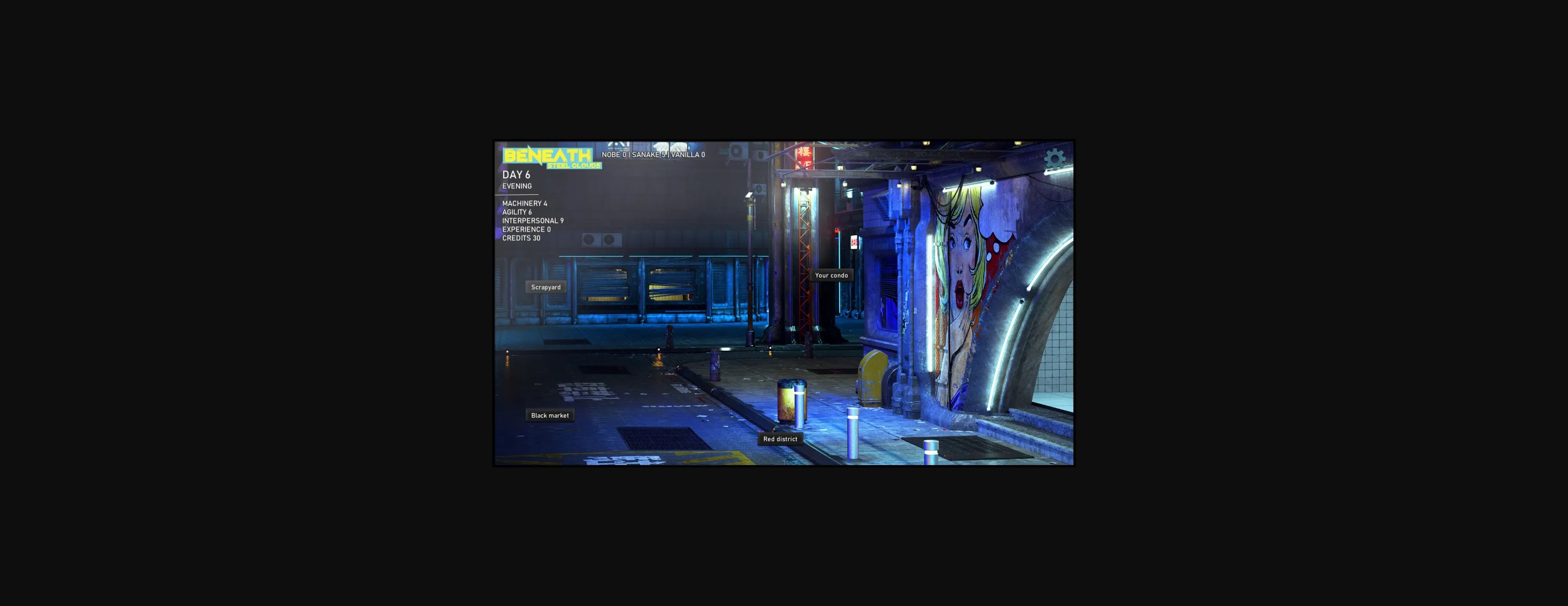 “Beneath Steel Clouds” is a life-sim set in a dystopian future with a cyberpunk aesthetic and themes but without the gritty, grim-dark tone and with a healthy dose of snark added on top. You have thirty days to get a grip on your life, earn (or get) some credits and hopefully get the girl. Get on it, chummer, things ain’t gonna solve themselves! They never do.