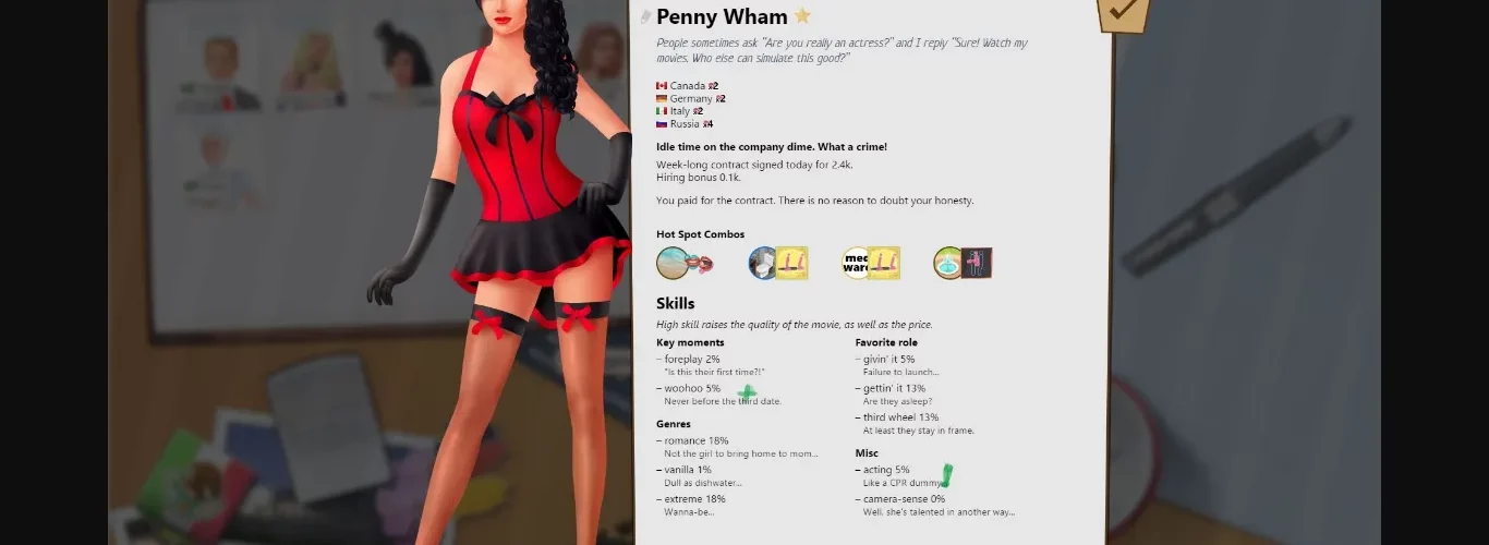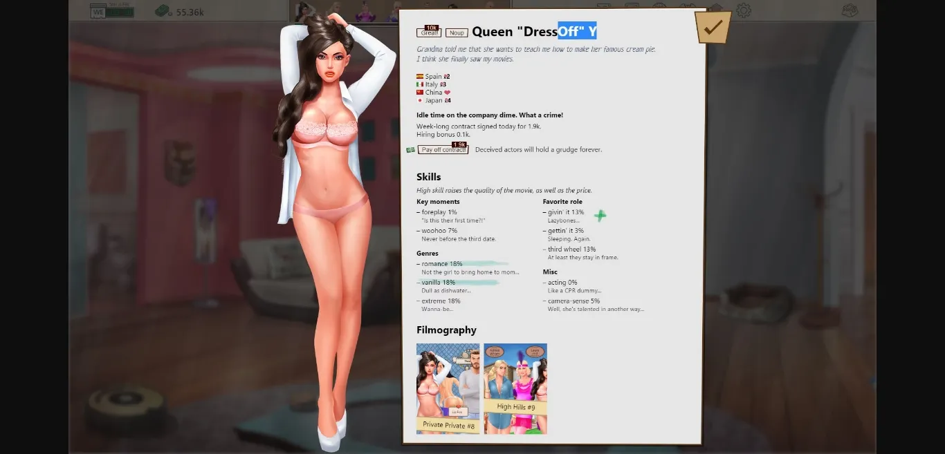 Actors like to put lies on their resumes and work for your competitors. And relax, obviously. What they don’t like is to get involved with a small studio. Choose your actors wisely. Take into consideration their favorite genres – romantic, vanilla, extreme – and preferences in different countries. And don’t forget to check actor’s skills, as well as director’s skills. Actually, we haven’t figured out the best way of selecting actors. So make up your own.