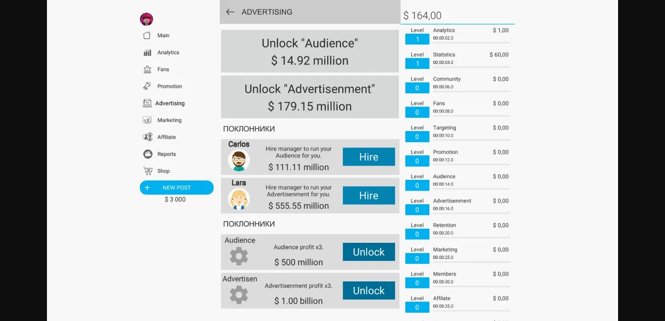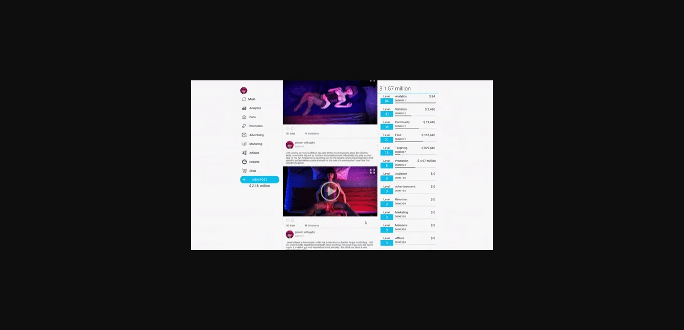After each level an amount of post becomes higher, and you need to hire manager and do analytics to build a huge fan base.