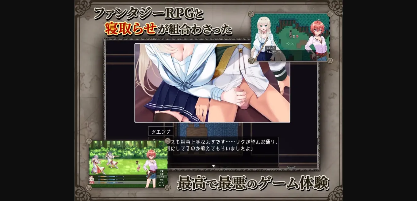 2D Game, 2DCG, Censored, Japanese Game, Male Protagonist, Multiple Endings, Voiced, Anal Sex, Ahegao, Bdsm, Big Ass, Big Tits, Bukkake, Corruption, Creampie, Drugs, Exhibitionism, Female domination, Footjob, Handjob, Harem, Humiliation, Male Domination, Masturbation, Multiple Penetration, Netorare, Oral Sex, Prostitution, Rape, Spanking, Teasing, Urination, Vaginal sex, Virgin, Voyeurism, Adventure, Fantasy, Religion, Romance, Turn based combat, Pregnancy