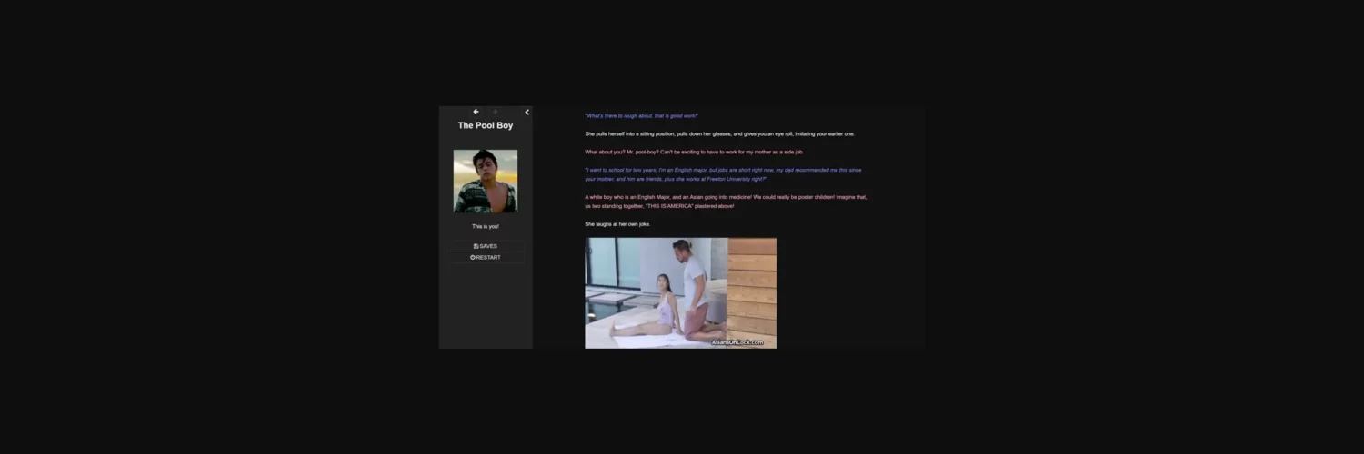 The Pool Boy, is an NSFW game set during the beginning of summer, and will eventually go on through unto Christmas. The basic premise is really unique and interesting, so, you start out as a mid-early 20’s man, going through the motions of life, and one day something exciting and out of the blue happens! I know you have never heard this plot string before! Your father offers you a job to work for his longtime friend, Dr. Zhao, which also happens to have three incredibly hot daughters, what happens next is up to you. Do you romance Mia, the youngest, shyest, and seemingly most responsible? Do you go after the bombastic, sarcastic, and more often careless middle child, Amelia? Perhaps you are more interested in thawing the cold heart of Ava, the oldest and most brooding of the three. Maybe you don’t give a worldly care about the daughters and instead would rather pursue the illustrious Mrs. Zhao! And maybe even your adopted sister? Guess that choice is now yours!