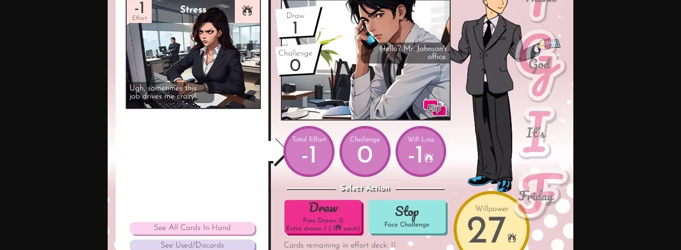 Based on the incredible solo card game âFriday" by Friedemann Friese, this is a tg/feminization/bimboification-themed deck-building game. Build your skills and defeat the challenges of an office internship, all while being transformed into the office hottie. Will you still have the willpower left to complete your final review?