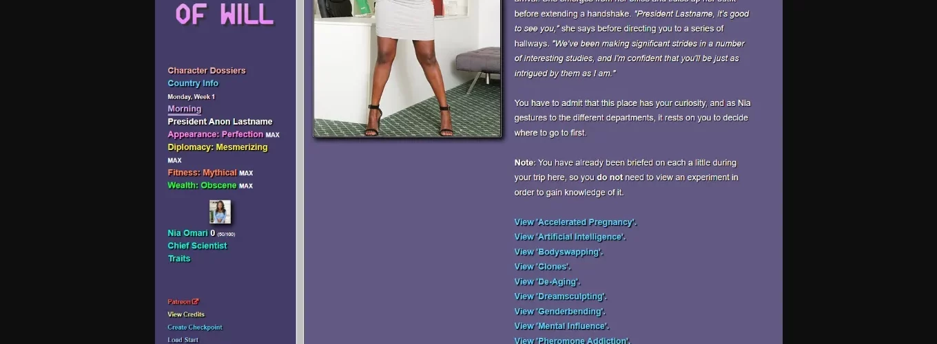 – Take a tour of a lab your government is secretly funding, with all kinds of interesting toys (including body swaps, mind control, personality alterations, bimbofication, genderbending, accelerated pregnancies, etc.).