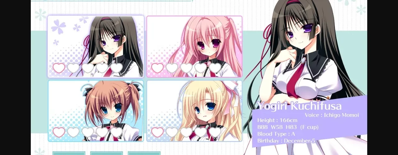 This game features eight romanceable characters, with each route containing five chapters for your enjoyment.