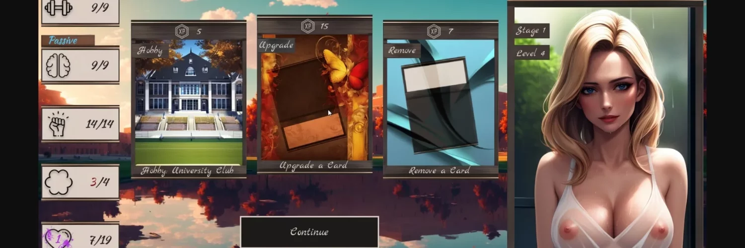 Inspired by games like "Slay the Spire" and "Ring of Pain" but with sexy girls and boobs: craft a unique deck, choose your own style, do activities with your crush, and overcome any obstacles put between you two.