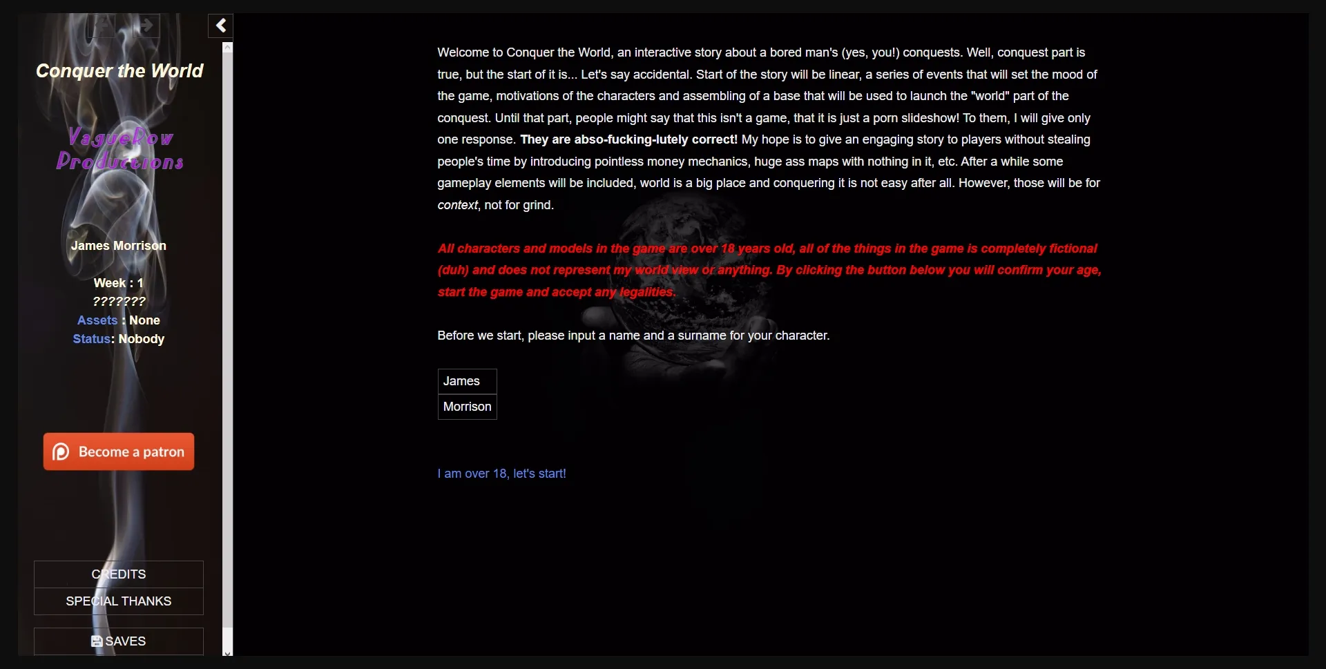 Our man (Enter player name here) was an ordinary person trying to salvage a future for himself in journalism, after a failed attempt at higher education. A request from the newspaper he was working as a freelancer, to check out a medical startup and their revolutionary interrogation drug started to open his eyes to a wider world. Always wanting to achieve more and written in history, he pushed these fantasies down deep in his mind as unrealistic. An encounter with a woman working at the facility changes his life, and pushes him to realize what he always wanted. Will you able to guide him in his path? What will happen to our character? Will he drown in power-lust, responsibilities and hostile plots? Or will he rise to the challenge and Conquer the World? It is up to you.