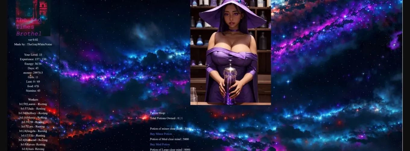 HTML game where the universe is coming to and end and every fantasy and fictional creation is entering reality. You decide with whatever time is left to open a brothel to get a taste of what has entered reality.