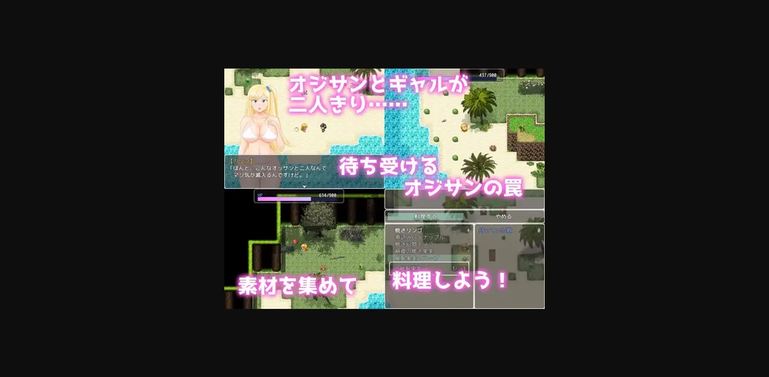 The gameplay of this RPG is simple, including only exploration and collecting materials. There is no gameover and the difficulty level is set lower. You can create health recovery items and gain health by collecting materials and cooking. Message skip and scene reminiscence functions are implemented. Easy mode is implemented.