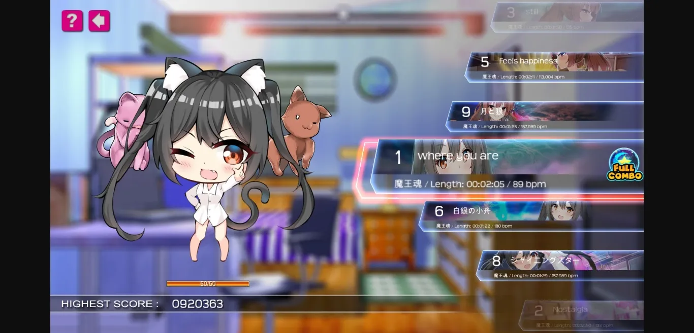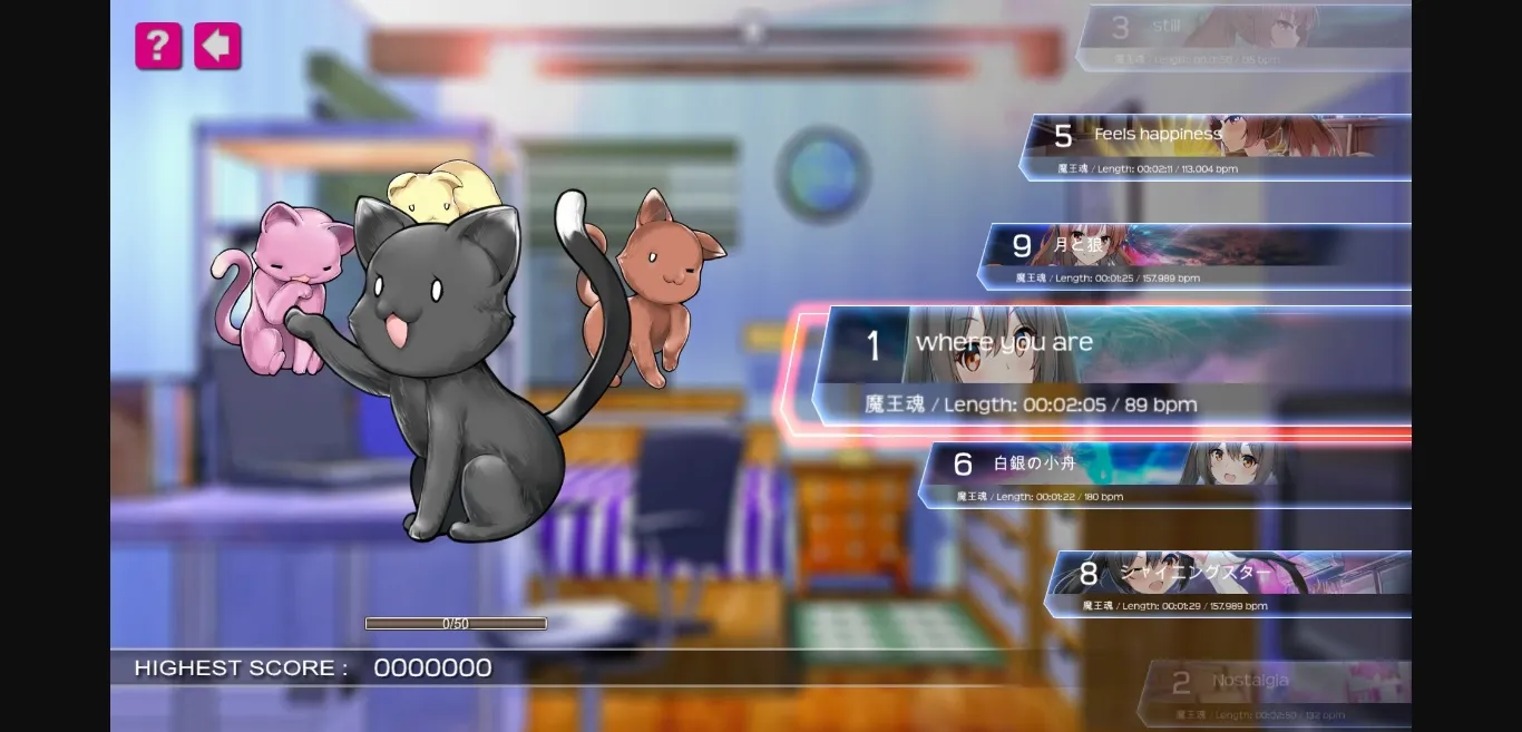 Player acts a guy who loves music. One day, he finds 4 abandoned cats and brings them home. Player needs to get scores by playing music and then you will receive items to feed or interact with cats. After taking wonderful care of these cats, their “gratitude” will be growing. Until they’re satisfied, they will become lovely and sexy kitty maids to repay.