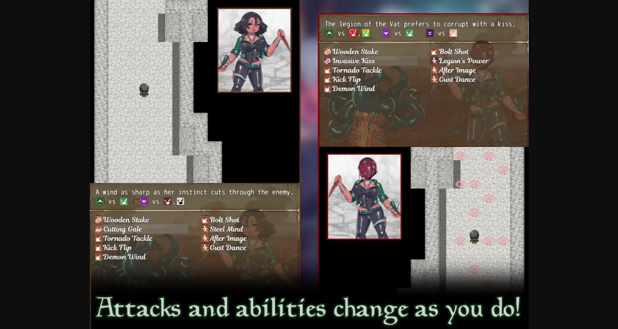 Veronica’s Body is a transformation fetish RPG and the sequel to . Play as Veronica and fight through waves of enemies as they try to humiliate and pervert her into kinky versions of themselves. These transformations change her actions in battle and may even grant her special abilities outside of battle. These erotic transformations aren’t necessarily a bad thing, however, because they may be necessary to progress through the dungeon or discover sultry secrets!