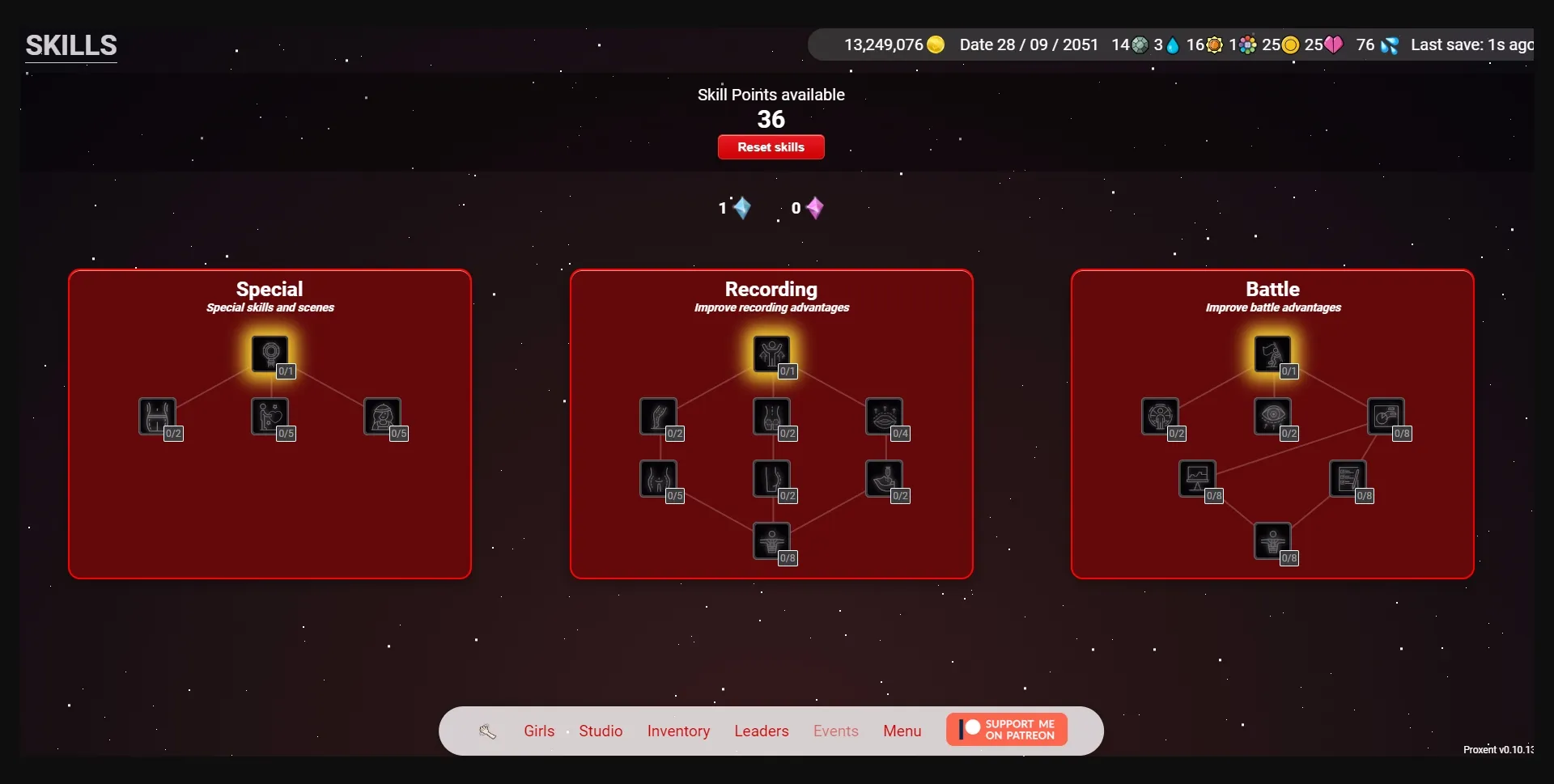 - Skills are limited by girl level – each 5 level grants +1 skill point