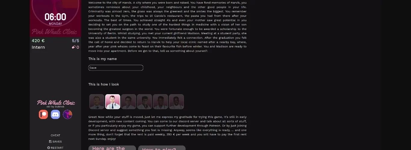 Pink Whale Clinic is an HTML life simulator set in the city of Harvik. You are a newly graduated MD on your journey to save the clinic from decline. You moved in with your girlfriend to an apartment, from which you will start exploring the world around you. Will you stay faithful for Madison, or you will try every apple in the tree? Choice is yours.