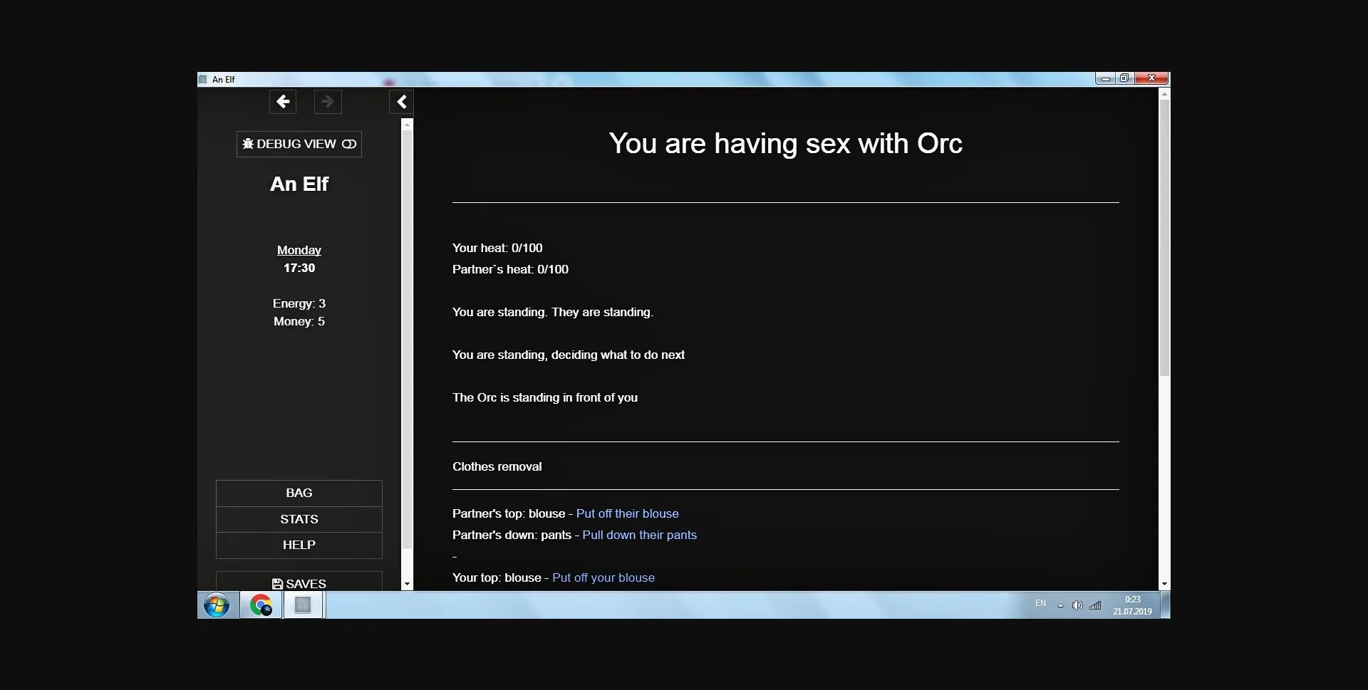 – I started to work on phrases and description in sex scenes. They will be based on the mood of enemy + your and their gender and/or genitals + your and their position. For now, only a few moves have different descriptions