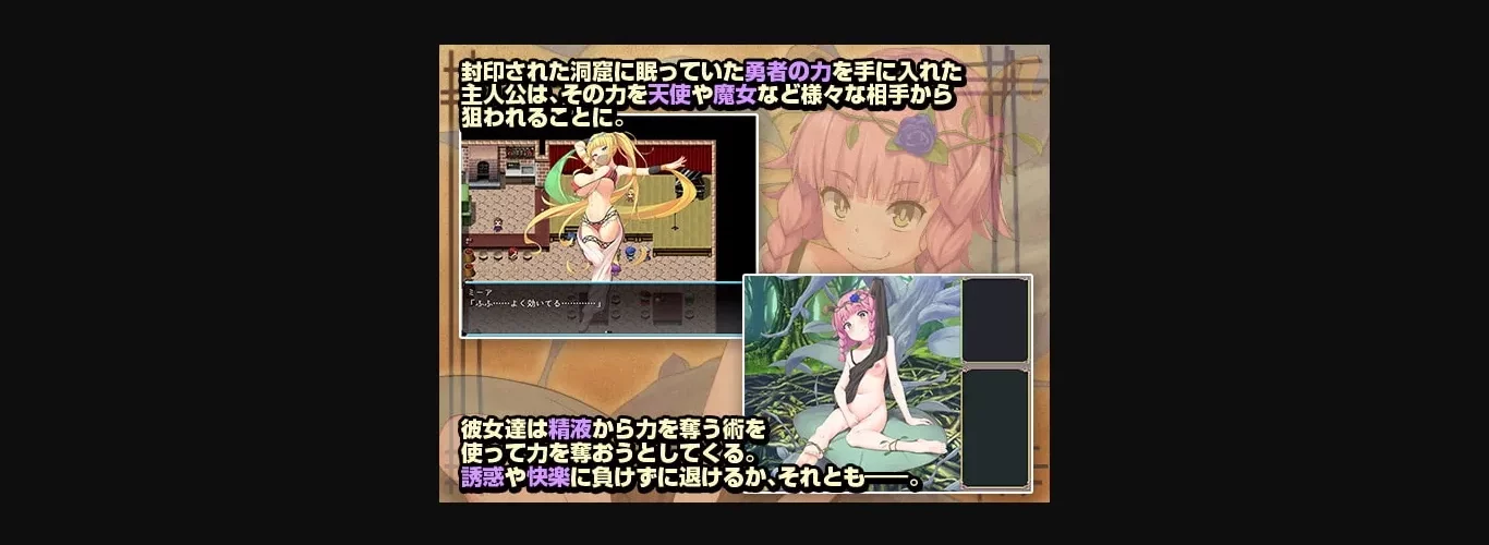 A man obtains the strength of a hero long sealed in a cave, and now angels and demons alike want his power! And they all know the same spell — Level Drain, which allows them to steal someone’s energy by making them cum. Will our hero be victorious against their sexual onslaught, or will he give it all up for pleasure…?