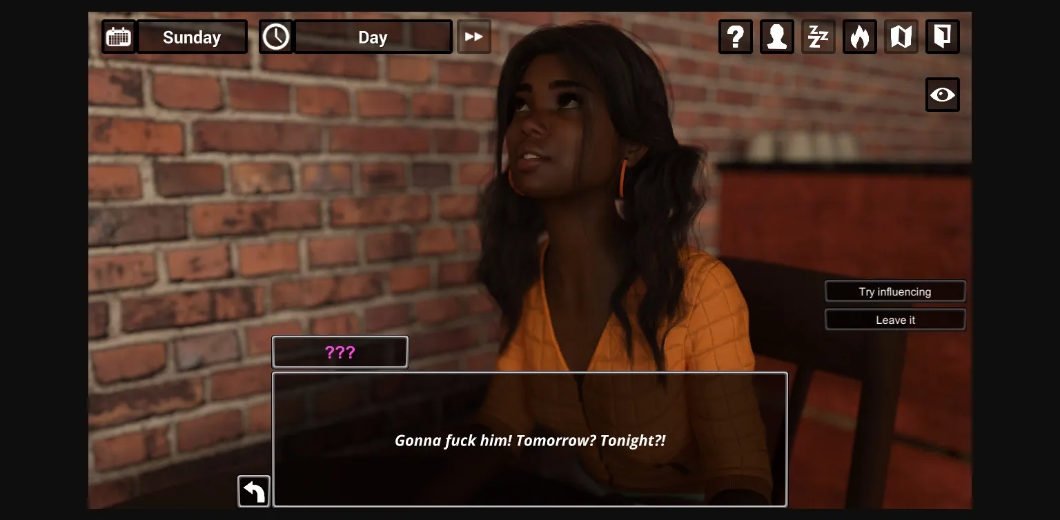 - Various additions: day/night cycle, several stats for MC(not all are used at the moment), MC’s power is not a 100% hit anymore, chance depends on power level, stats of the character MC is trying to affect(hidden for now, several systems allowing changing them will come shortly) and other factors. Added support for saves for future versions starting from 0.03. Added full screen button to options in the main menu.