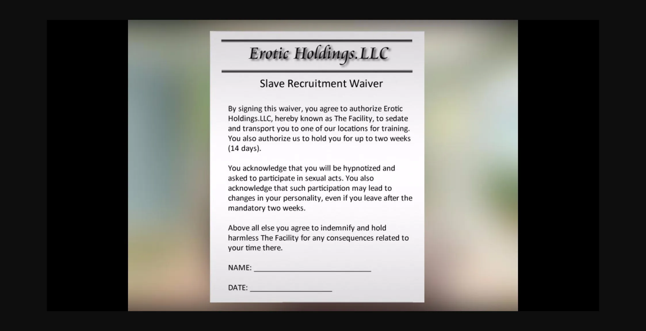 The Facility recruits people like you for a two week training period. After two weeks you’re given the choice to leave or stay with them. Now one of their people is coming to take you there. If you agree to go with her, you’ll gain access to a life of safety, luxury, and sexual pleasure. However you’ll also be hypnotized and trained to become a sex slave.
