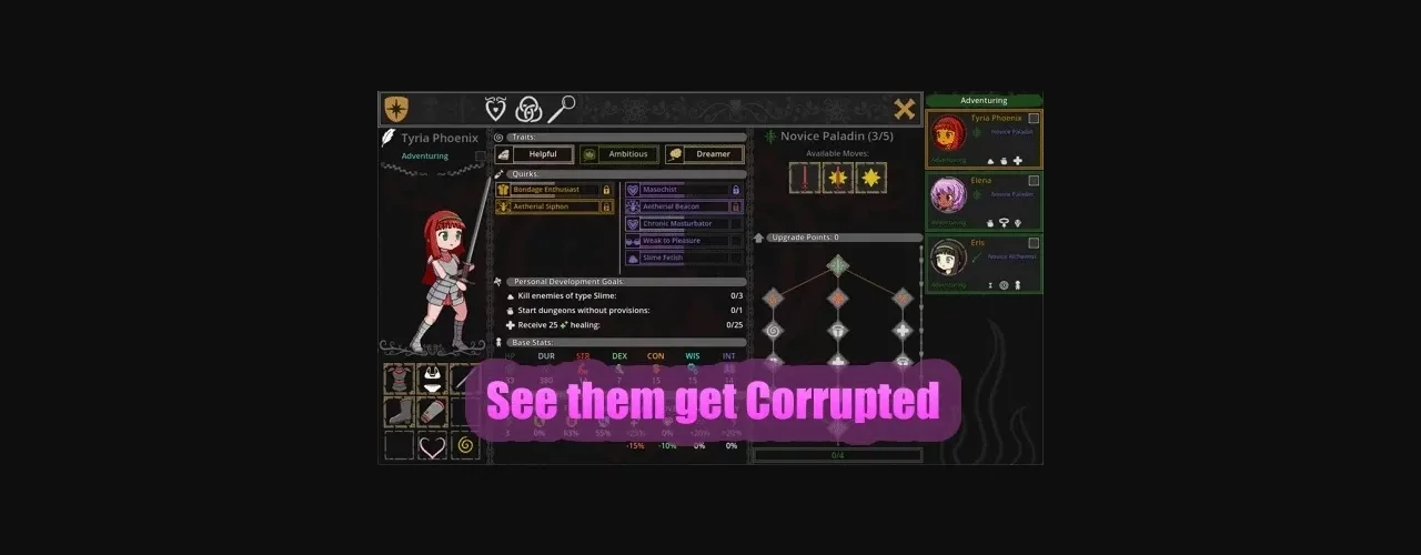 2D Game, Multiple Protagonists, Female Protagonist, Bdsm, Corruption, Exhibitionism, Sex Toys, Tentacles, Fantasy, Mind Control, Rpg, Turn Based Combat, Pregnancy, Lactation