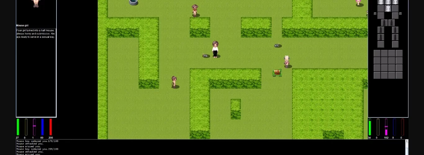 Labyrinth is a rogue like RPG game where you enter a maze and fight your way to more and more challenging levels. The maze contains many various monsters which you can fight with sword, spells or with various kinky acts to gain experience and get better in whatever you prefer to use. The game is focused on transformation, body part changes and mind control. It contains several hundreds of effects that may happen to the player and player may inflict them on the monsters as well, the effects may be combined and stacked creating huge number of situations. The kinky combat provides full flexibility in terms of what can be done by the player and what would be done by monsters (who have simple AI). Did you miss possibility to shrink the monster and play with it, perhaps let is go to places no man has gone before? It is possible to slowly transform the body into rubber and inflate it until it blows up or deflate it or transform your foes into lingerie and let them caress your body.